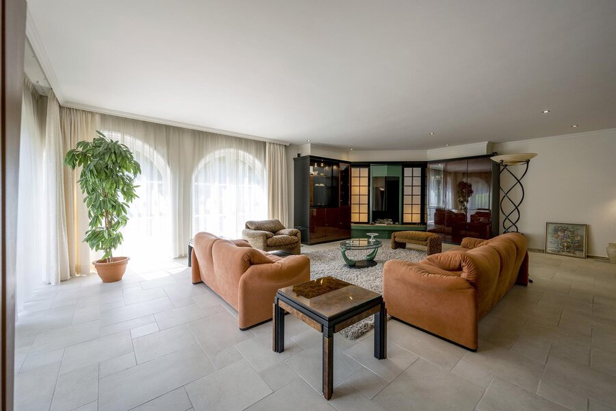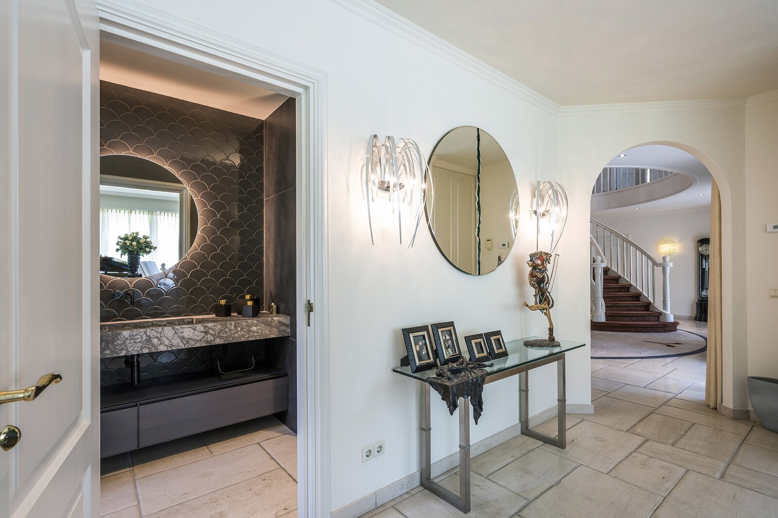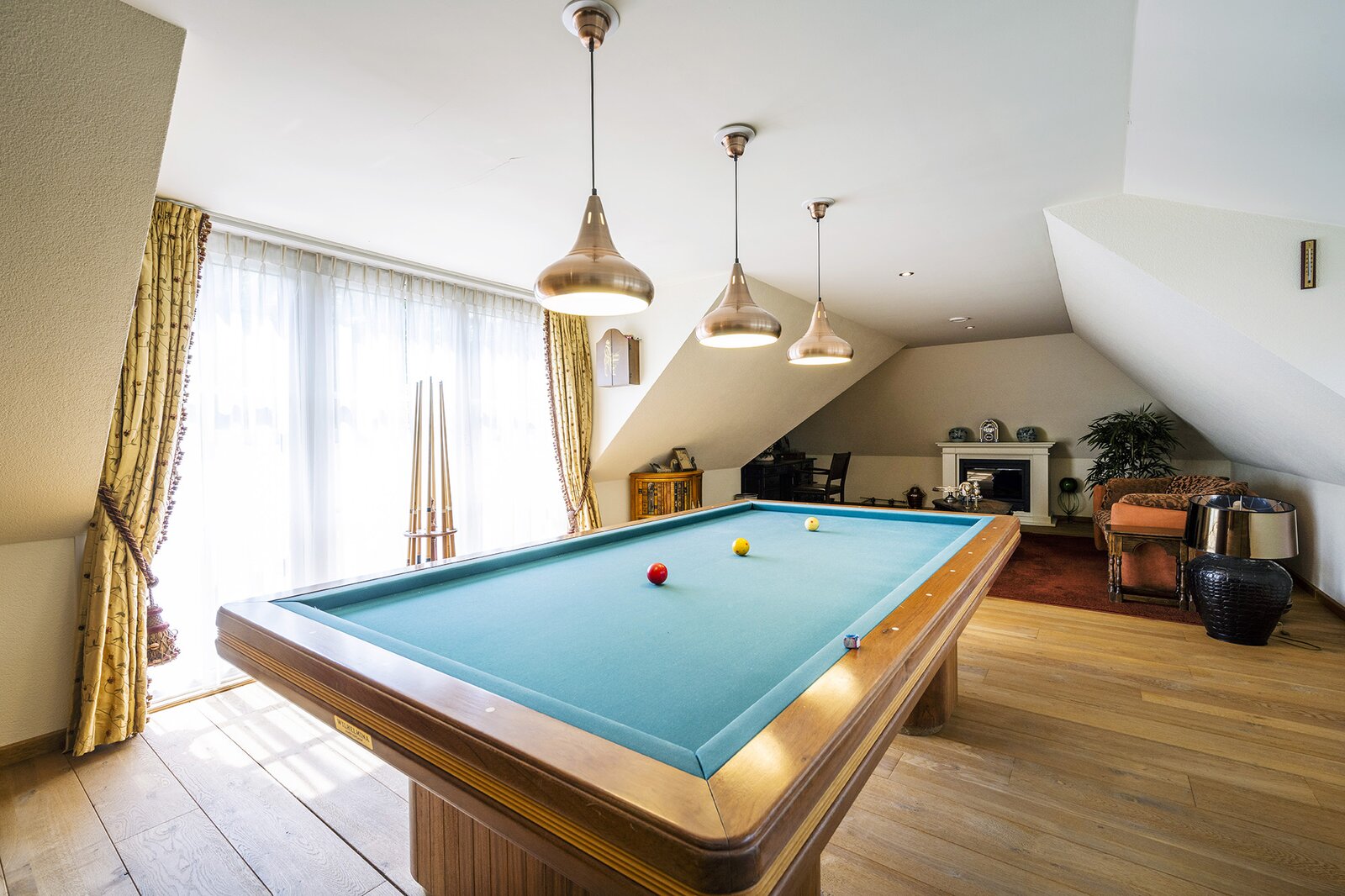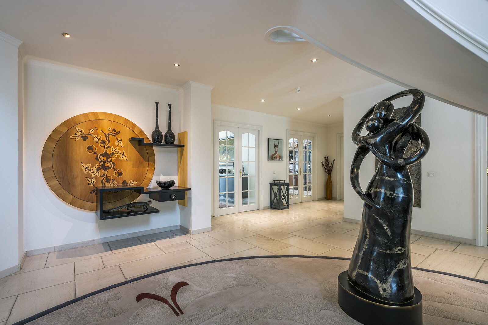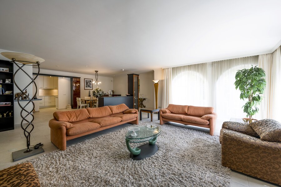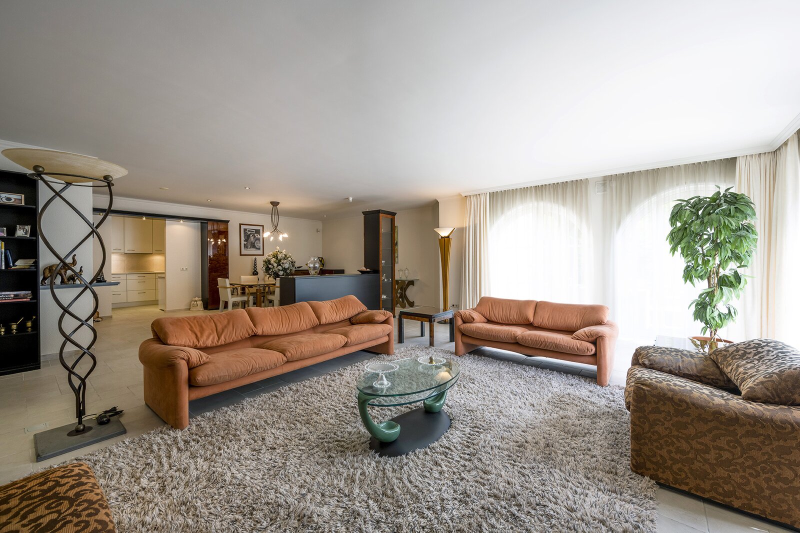 Dat uw villa midden op een meer dan 10.000 vierkante meter groot perceel staat en dat de buren ook niet op een postzegel wonen, draagt daar uiteraard aan bij. Sluit uw op afstand bedienbare toegangshek en u sluit de wereld buiten. Op ‘eigen erf’ vindt u vervolgens alles wat het leven aangenaam maakt, in aanvulling op uw buurtwensen. Tennisbaan? Check. Riante parkeergelegenheid – indoor én outdoor – voor uw collectie bolides? Check. Een lift? Check, dus daarmee is ook de levensloopbestendigheid geregeld. Binnenzwembad? Is er. Knoeperd van een buitenvijver? Vanzelfsprekend en mét koikarpers. Een inpandig maar wel volstrekt zelfstandig gastenverblijf? Maar natuurlijk. Wijnkelder? Bien sûr. Een alarminstallatie waar Fort Knox zich niet voor hoeft te schamen? Hoort erbij, op dit niveau. Want we hebben het hier over een villa in de buitencategorie: gebouwd in 2000/2001, met dik 1.000 – ja, duizend – vierkante meter woonoppervlak, verdeeld over vier etages, waarvan drie bovengronds plus een compleet geoutilleerd souterrain voor uw gasten of au-pair (met zelfs een eigen terras, dus die gasten krijgt u nooit meer weg; zeg niet dat we u niet gewaarschuwd hebben). De afwerking is tijdloos en van topkwaliteit, van de natuursteen vloeren op de begane grond tot de keramische leien op de zacht glooiende daken. Onder de brede overstek stroomt daglicht binnen door talloze roede-verdeelde ramen en openslaande deuren. En rondom, in de Engelse landschapsstijl aangelegde tuin, ziet u enkel 50 tinten groen.