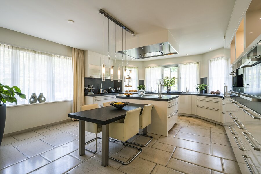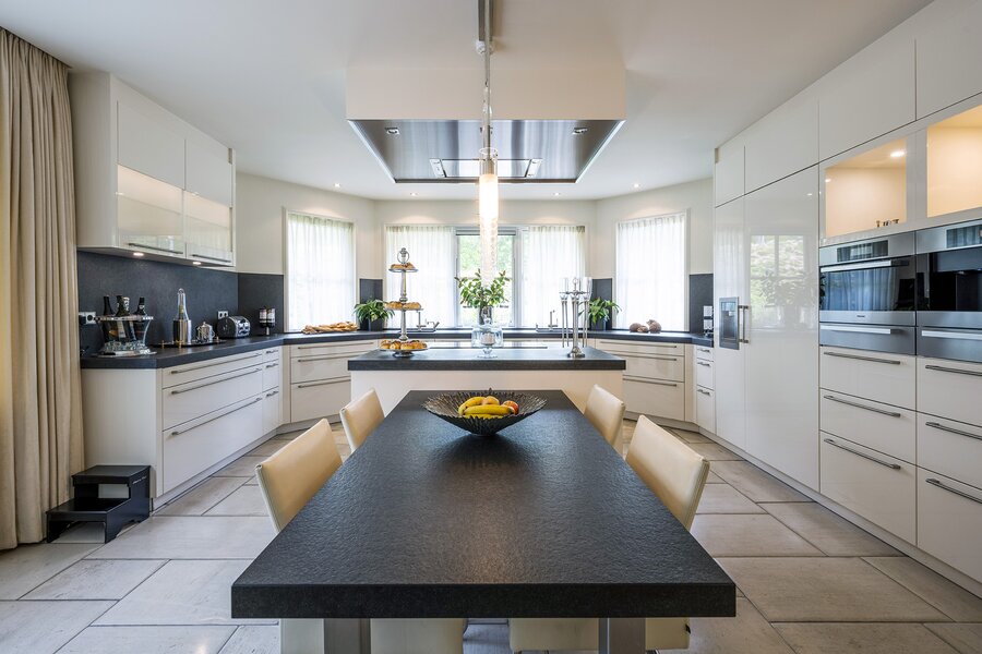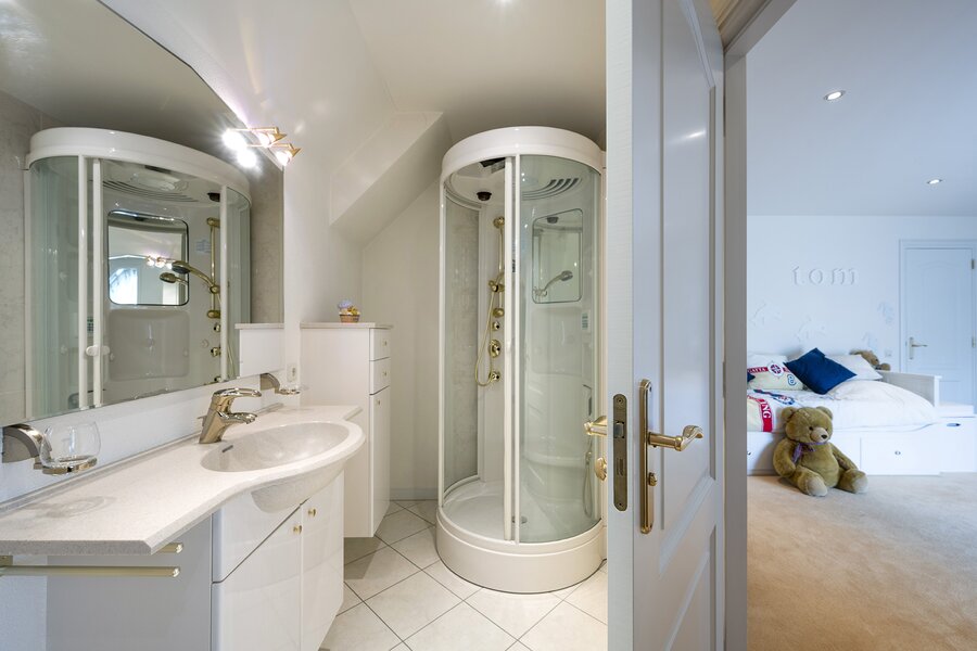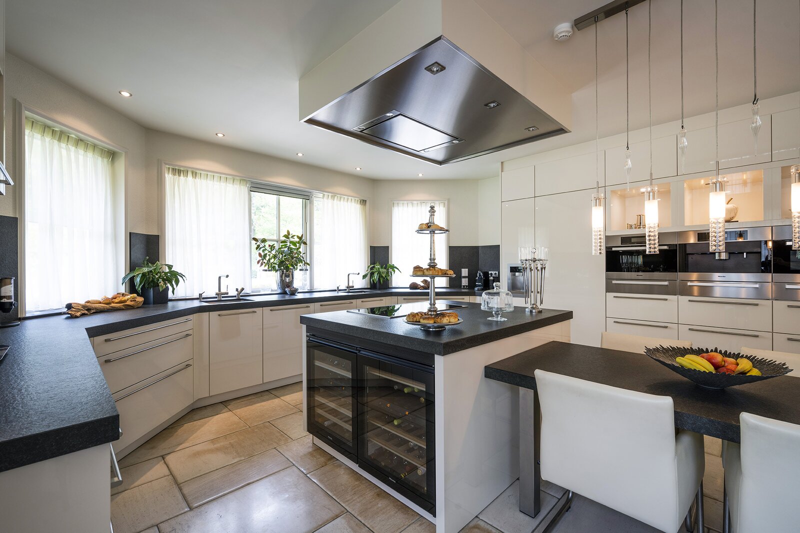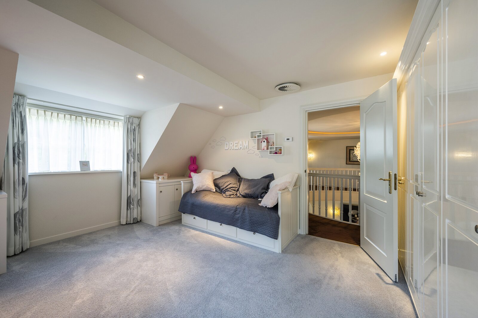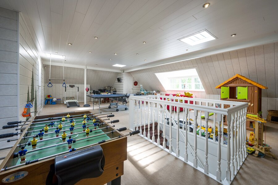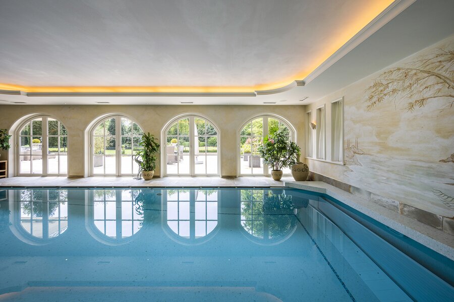 De heerlijke woonkeuken beschikt over alle apparatuur die u zich kunt wensen, tot en met uw eigen bruiswatermachine. De diverse badkamers – iedere slaapkamer heeft een eigen of Jack & Jill-badkamer – zijn hotelwaardig en in het riante zwembad trekt u uw baantjes. Zet hier ’s zomers de vier sets openslaande deuren naar het aanpalende terras open en de Malediven kunnen u feitelijk gestolen worden. Alle leefruimtes zijn zeer ruim bemeten, maar nergens voelt dit huis té groot. Een keuze aan zithoeken, haarden en een uitgekiend lichtplan creëren sfeer en een gevoel van warmte. Letterlijk wordt die warmte – afgezien van de gasgestookte open haarden – overigens geleverd door met warmtepompen gevoede (vloer) verwarming. Een prettig en duurzaam binnenklimaat, dus. Goed voor het geweten én de portemonnee. Nu alleen nog even een goede fiets…