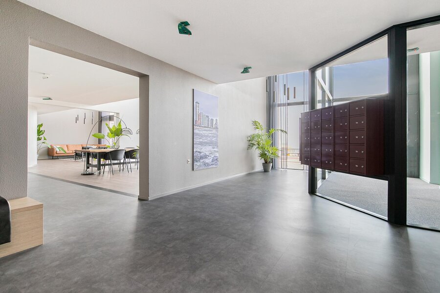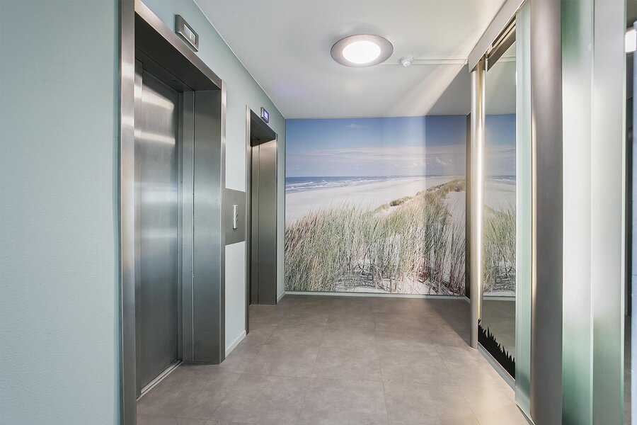 Het meest prestigieuze appartementengebouw van de Boulevard heeft een mooie entree met loungehoek en leestafel. Via één van de twee snelle liften komt u uit op de 14e verdieping met toegang naar slechts twee appartementen.