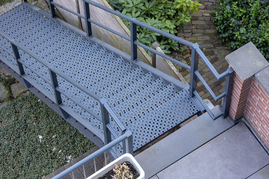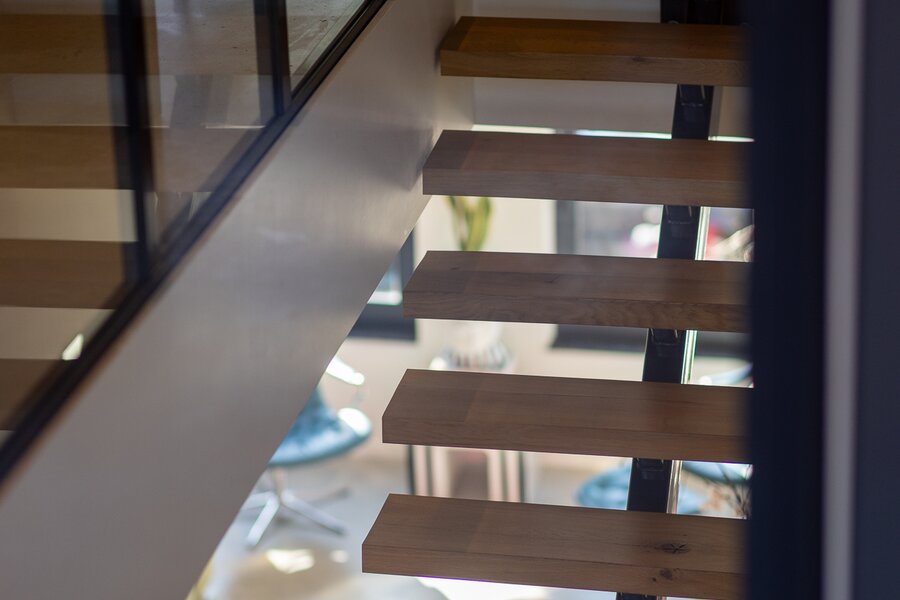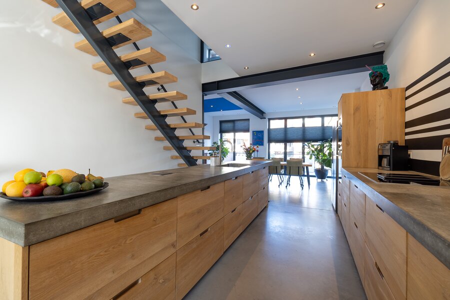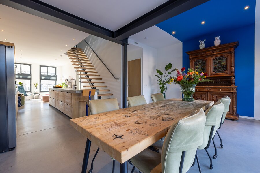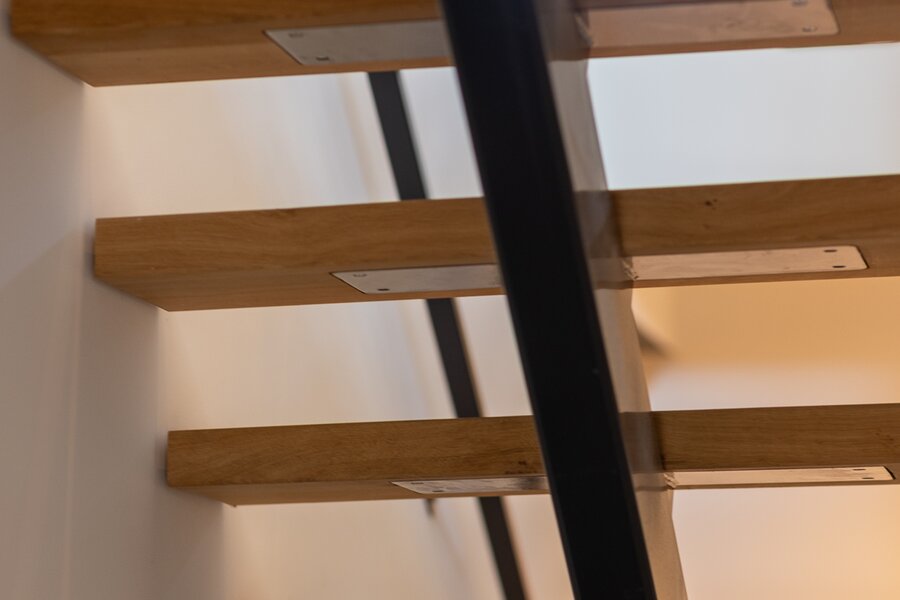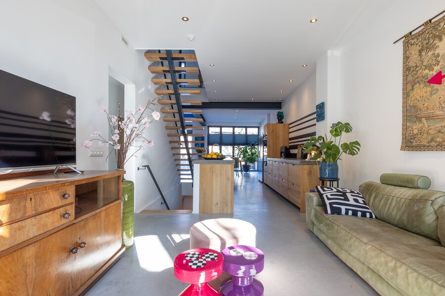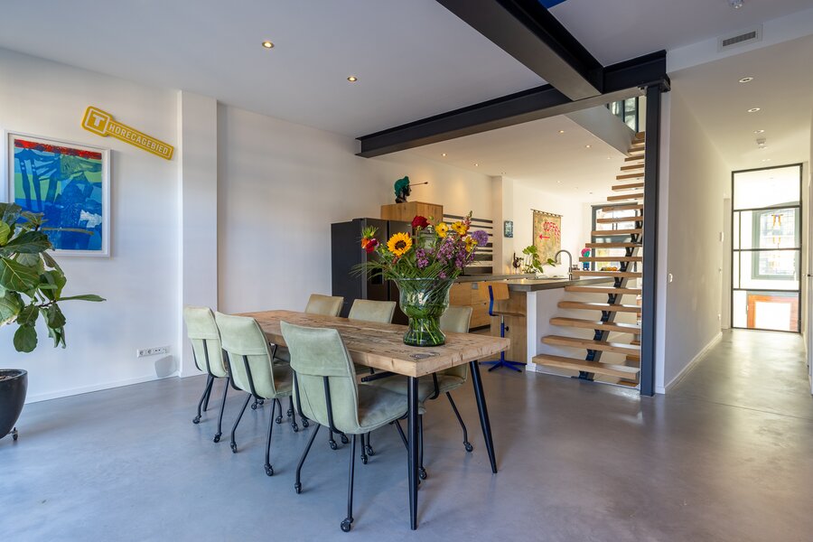 De interne stoere, open trap van staal met massief eiken treden is een eyecatcher is deze ruimte. De trap biedt toegang tot de tweede verdieping en de begane grond.