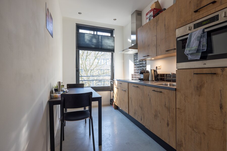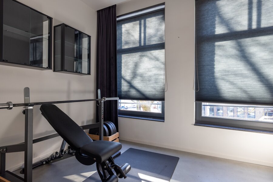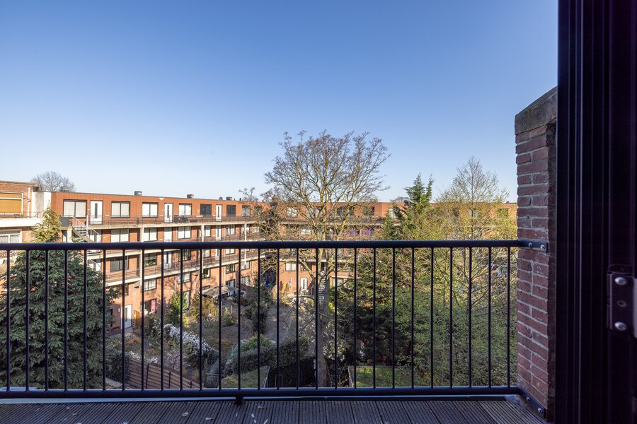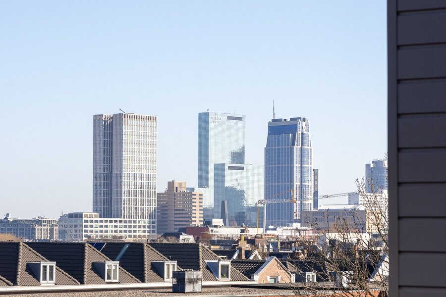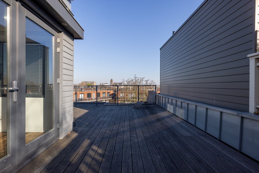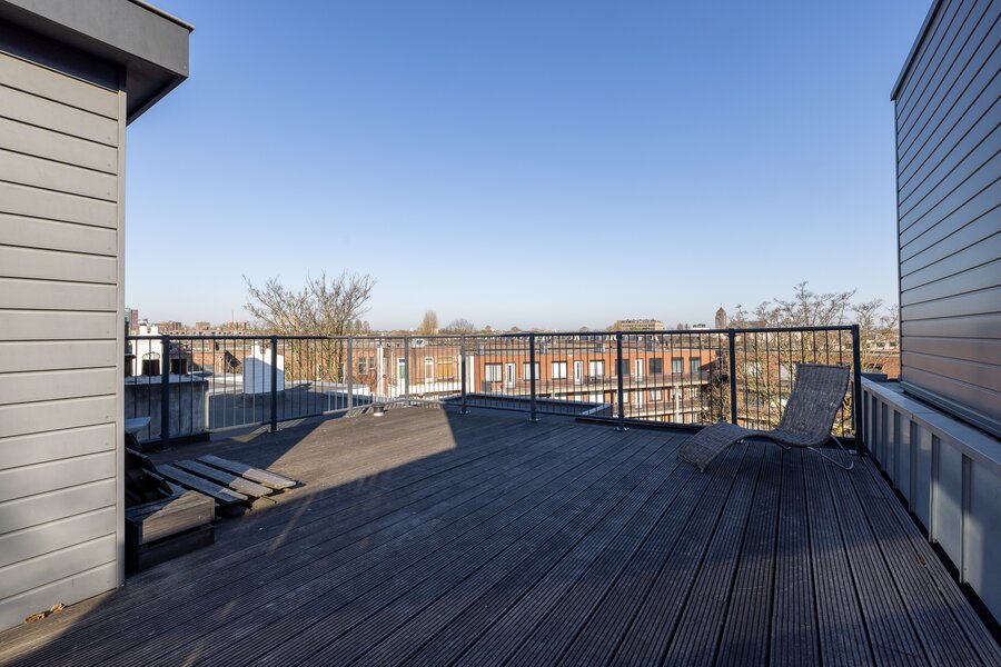 Op het platte dak is een riant dakterras gecreëerd met dakopbouw. Vanaf hier heb je een mooi wijds uitzicht over de stad.