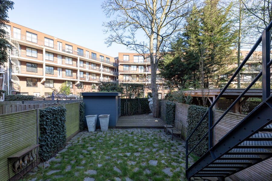 De tuin is ca. 15 m diep en heeft een oriëntatie op het noordoosten, vanwege de diepte is er gedurende de dag zowel zon als schaduw te vinden. De tuin is bereikbaar via een trap vanaf het ruime balkon gelegen aan de woonverdieping, daarnaast via de 2 slaapkamers op de begane grond. Er is een houten berging gevestigd ideaal voor het stallen van fietsen en tuingereedschap.