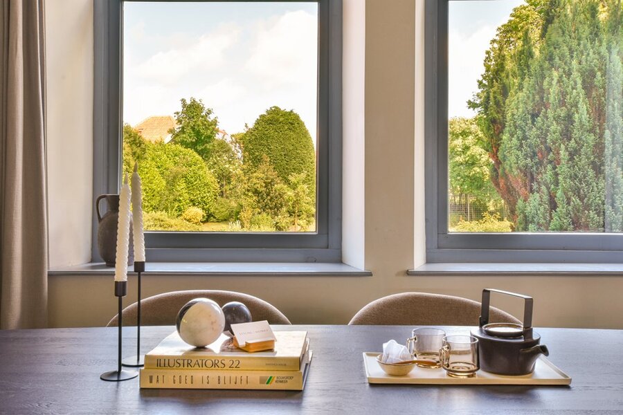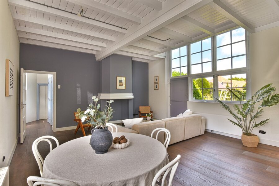 Eenmaal binnen ervaart u hoe karakter en comfort hand in hand gaan. De hal biedt toegang tot de eetkamer, het hart van het huis. Grote ramen zorgen voor een overvloed aan natuurlijk licht en bieden uitzicht op de prachtige groene tuin. De zachte wandkleuren creëren een rustige en uitnodigende sfeer.