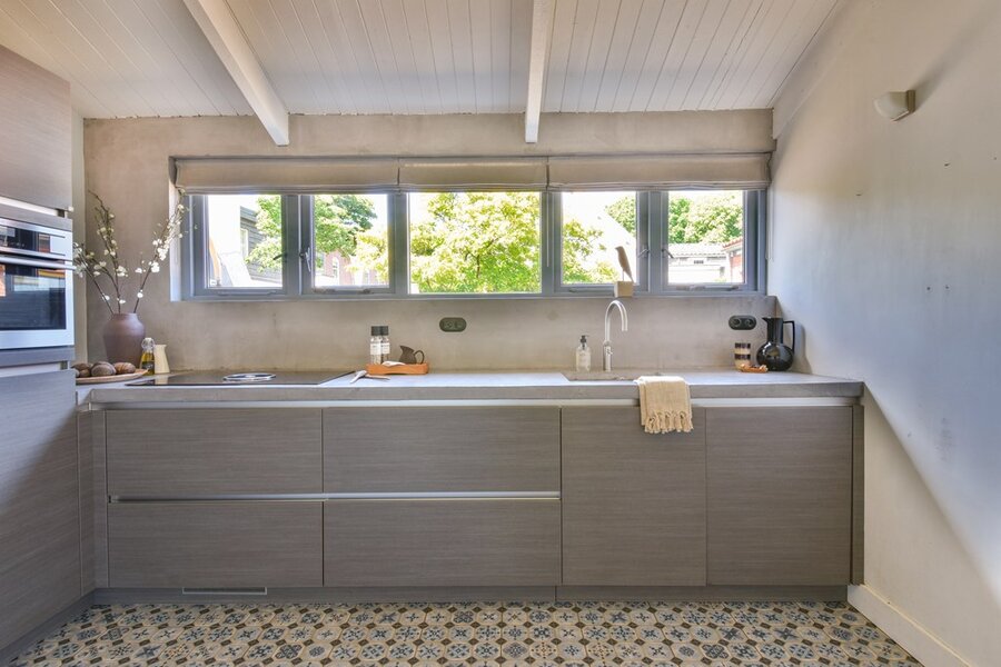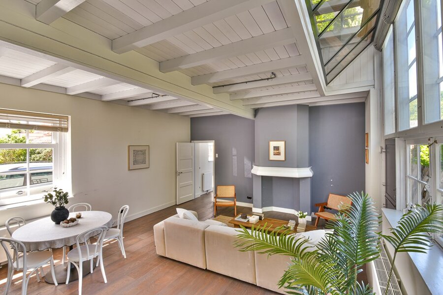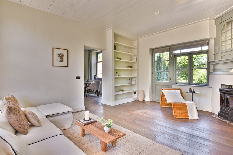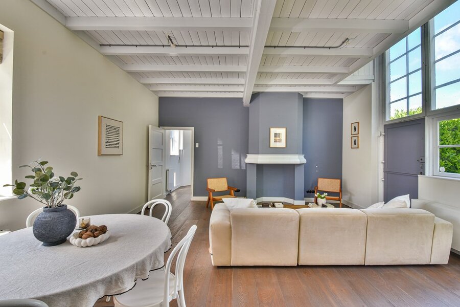 Vanuit de hal betreedt u een royale doorloopkamer die op verschillende manieren gebruikt kan worden — als werkruimte, atelier of extra zitkamer. De kamer ademt rust en eenvoud, met het licht dat op natuurlijke wijze binnenvalt via de ramen met karakteristieke roedeverdeling. Vanuit hier is er toegang tot de moderne badkamer én tot een charmante (slaap)kamer, die dankzij het raam met roedeverdeling een prachtig uitzicht biedt op de groene achtertuin.