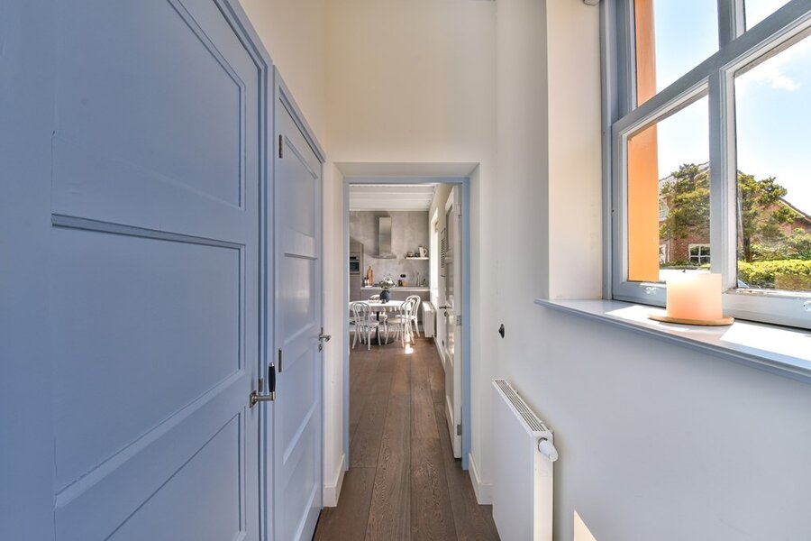 Aan het einde van de gang leidt een trap weer naar beneden, waarmee de cirkel van dit bijzondere huis zich sluit. U komt uit bij de entree, waar de eerste indruk werd gevormd en het karakter van de woning zich direct al liet zien. Deze doordachte routing versterkt het gevoel van verbinding in het huis. Elke verdieping staat met elkaar in contact, zowel ruimtelijk als qua sfeer. Het is een woning waarin historie, charme en comfort op natuurlijke wijze samenkomen.