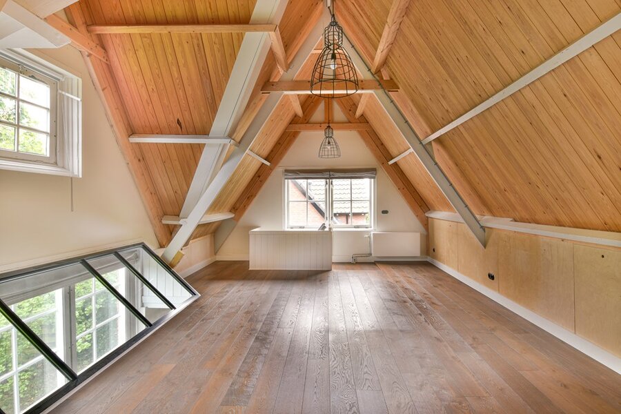 Boven aangekomen betreedt u een ruime, open zolderkamer die dankzij de hoge nok van het puntdak met karakteristieke houten balken een bijzonder lichte en sfeervolle ruimte vormt. Aan de zijkant bevindt zich een mooie glasconstructie voor extra licht inval waardoor u op een unieke manier naar beneden kunt kijken en contact voelt met de rest van het huis.