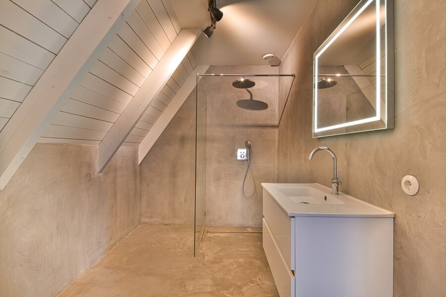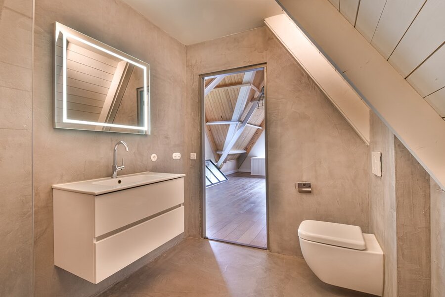 De zolder is voorzien van een moderne badkamer die comfort en functionaliteit combineert met de historische charme van het pand. De badkamer is uitgerust met een douche, wastafel en toilet. Het schuine dak zorgt voor een sfeervolle uitstraling.