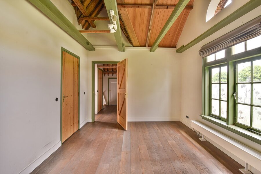 Langs de gang vallen opnieuw de prachtige schuine houten plafonds op, die overal in de woning het karakter benadrukken. Aan het einde van de gang bevindt zich nog een afsluitbare ruimte, ideaal als bergkast of extra opslag, netjes weggewerkt in de architectuur van het huis.