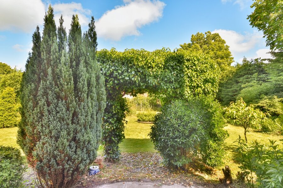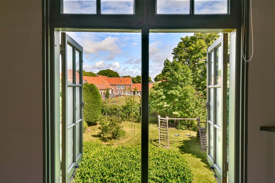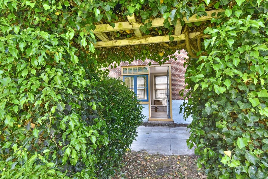 Wanneer u vanuit de tuin naar de woning kijkt, lijkt de tijd even stil te staan. Het weelderige groen omlijst de gevel als een levend schilderij, terwijl de karakteristieke raampartijen met hun sierlijke ruitjes een bijna betoverende uitstraling geven. Het geheel ademt een romantische sfeer . Een zeldzame harmonie tussen natuur en architectuur geeft dit huis zijn unieke ziel.