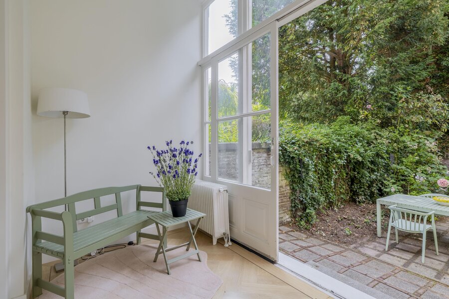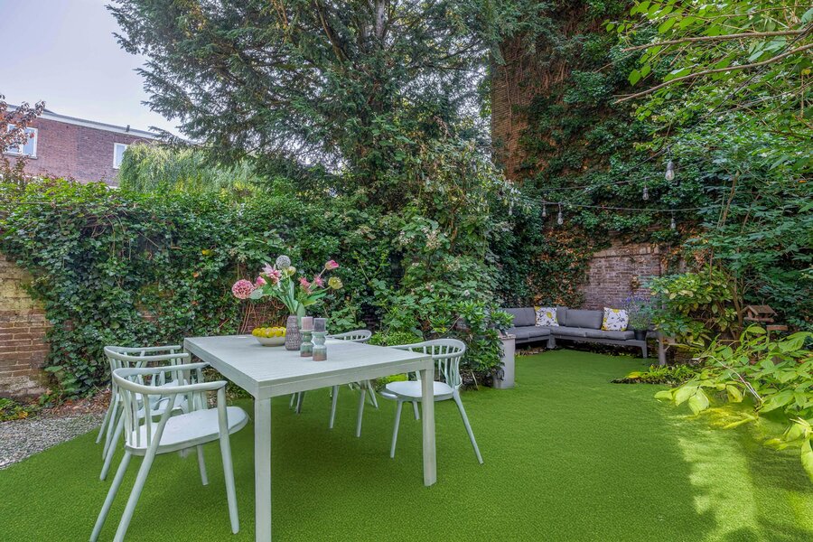 De besloten tuin is maar liefst 10 meter diep en gelegen op het zuidoosten. Dankzij de fraaie indeling met meerdere terrassen, borders en volwassen beplanting is dit een stadsparadijs waar rust en privacy overheersen. De serre vormt de natuurlijke verbinding tussen binnen en buiten.