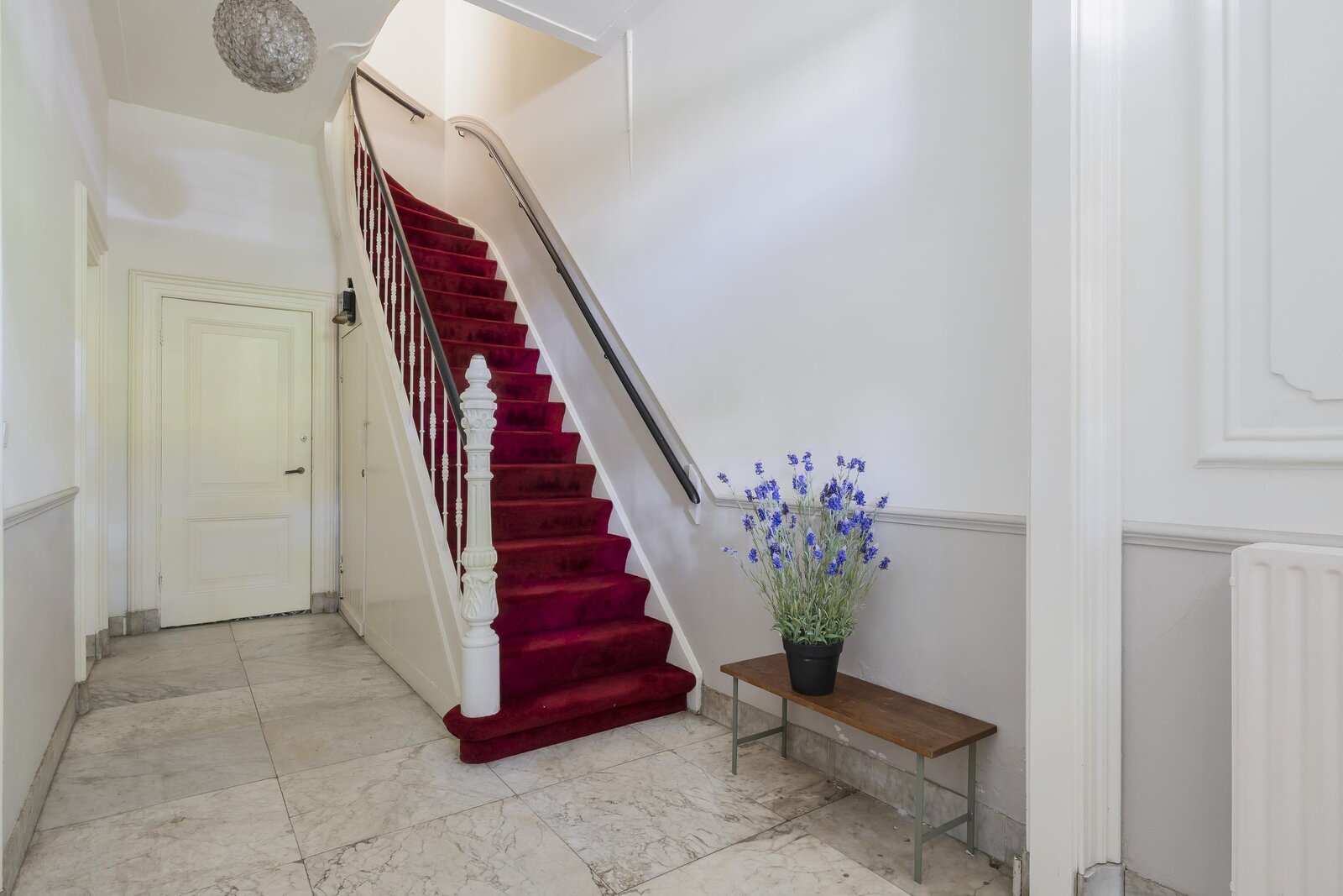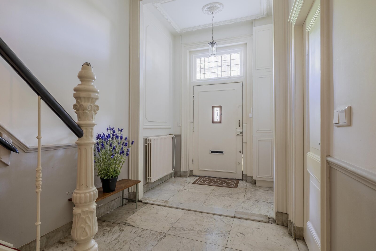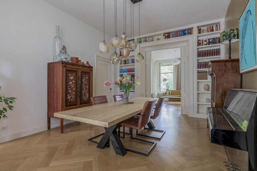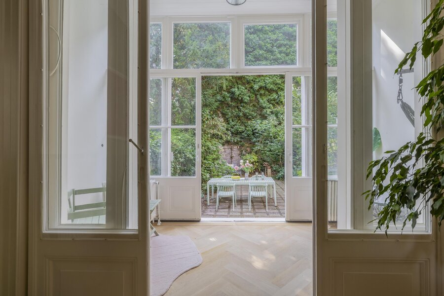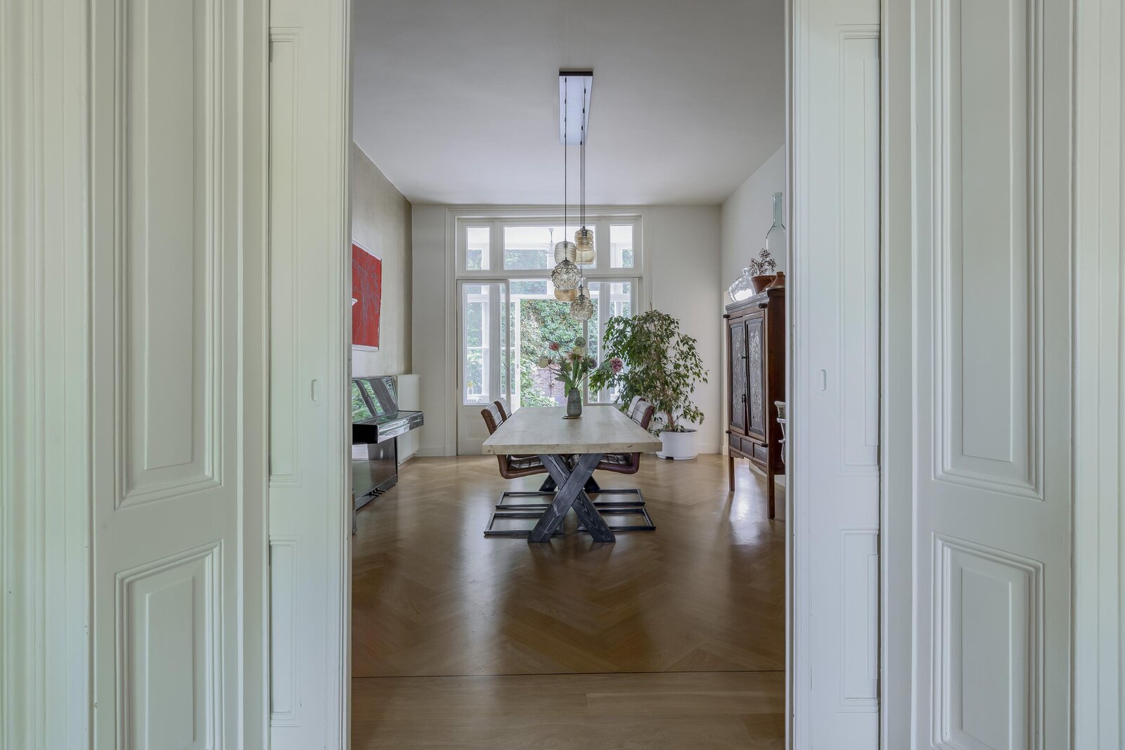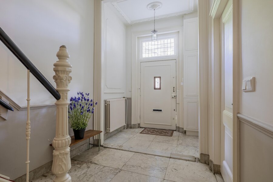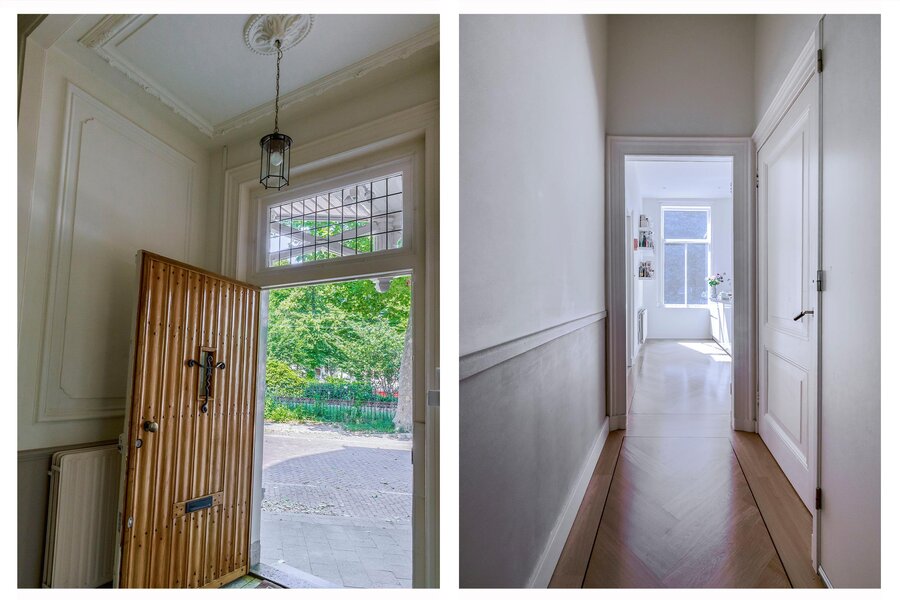 Via drie treden in natuursteen en een klassieke voordeur betreed je de beletage. De ruime hal geeft toegang tot een toilet en badkamer met een douche en dubbele wastafel een ruime kelder/souterrain met aparte ingang vanaf de voorkant en natuurlijk de leefruimtes. Aan de voorzijde bevindt zich de eetkamer met authentieke details en fraaie lichtinval. Aangrenzend de open keuken (2020), voorzien van alle denkbare inbouwapparatuur, waaronder een inductiekookplaat, oven en afzuiging. De serre aan de achterzijde verbindt binnen met buiten op een lichte en natuurlijke manier. Hier is het op zonnige dagen heerlijk vertoeven met zicht op de tuin.