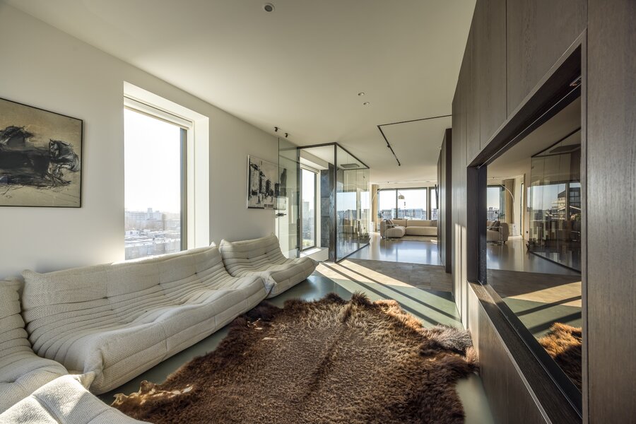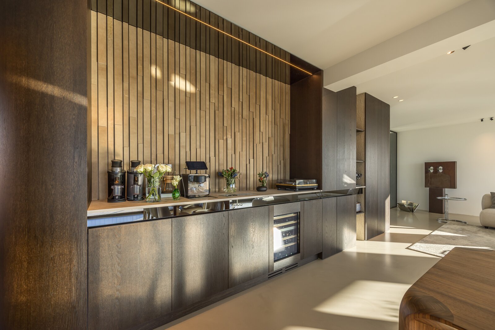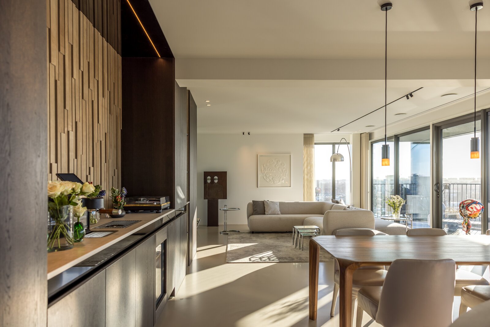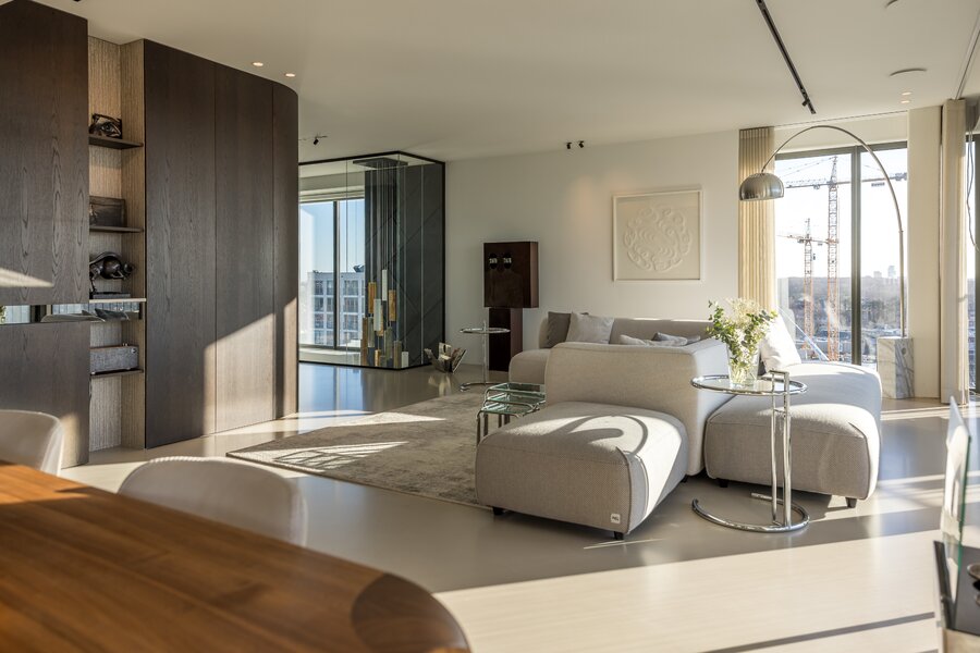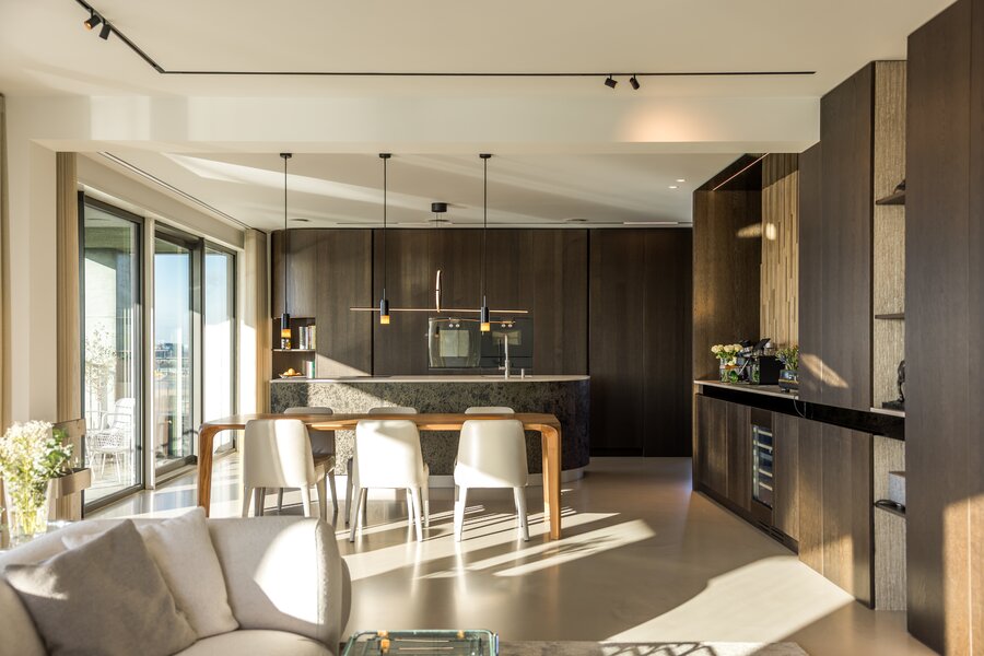 To the right lies the bespoke kitchen, equipped with exclusive appliances from Gaggenau, Siemens, Quooker, and Bora. The kitchen and dining area form the heart of the home and flow openly into the living space. A central integrated coffee bar with a Decent espresso machine and wine climate cabinet has been incorporated. Large windows and long sightlines in the spacious living room ensure abundant natural light and views toward the city. The adjacent southwest-facing balcony extends the living area and is perfect for long evenings outdoors.