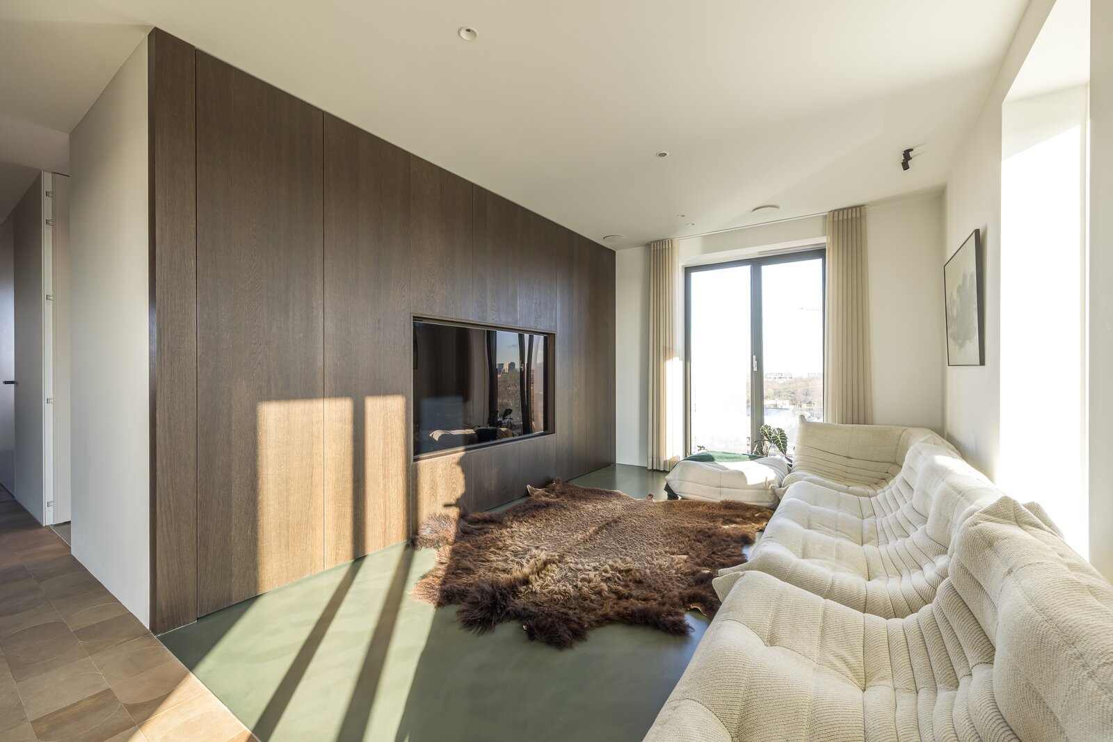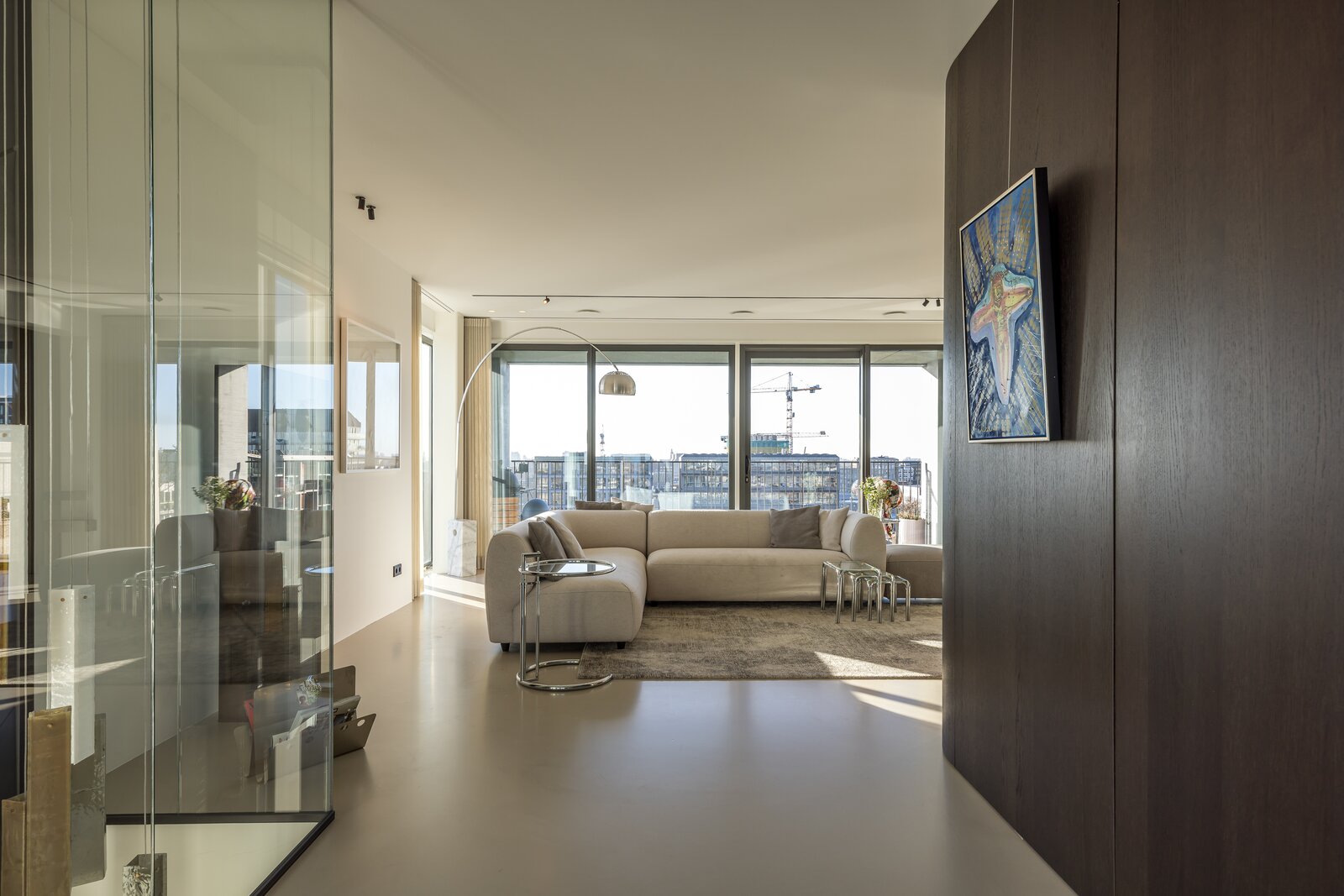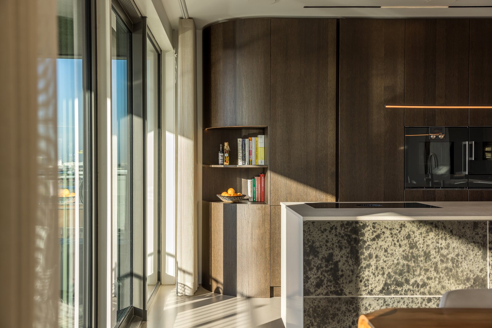 To the right lies the bespoke kitchen, equipped with exclusive appliances from Gaggenau, Siemens, Quooker, and Bora. The kitchen and dining area form the heart of the home and flow openly into the living space. A central integrated coffee bar with a Decent espresso machine and wine climate cabinet has been incorporated. Large windows and long sightlines in the spacious living room ensure abundant natural light and views toward the city. The adjacent southwest-facing balcony extends the living area and is perfect for long evenings outdoors.