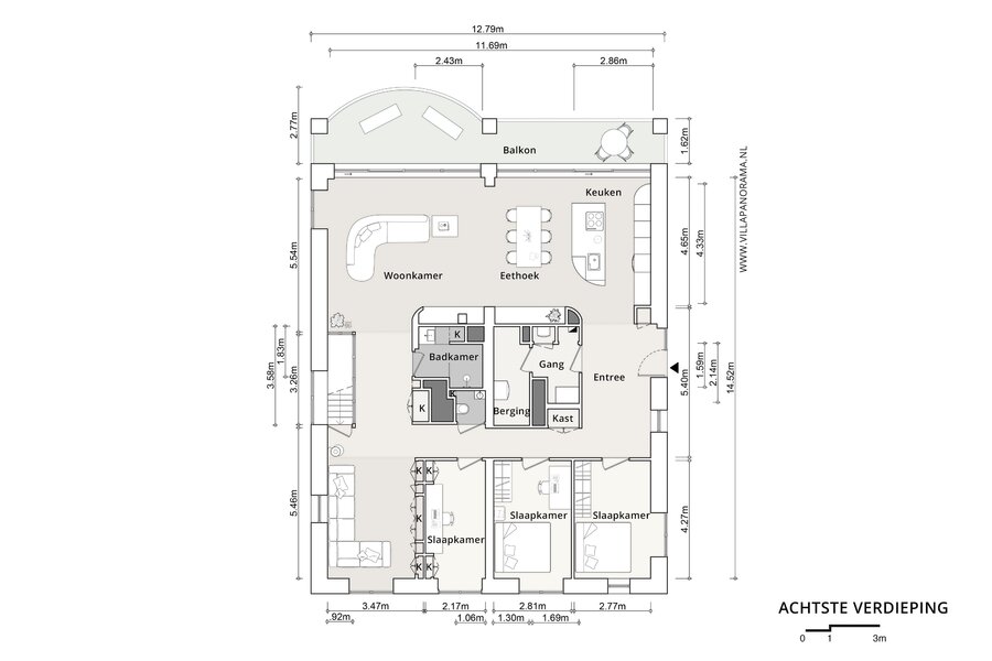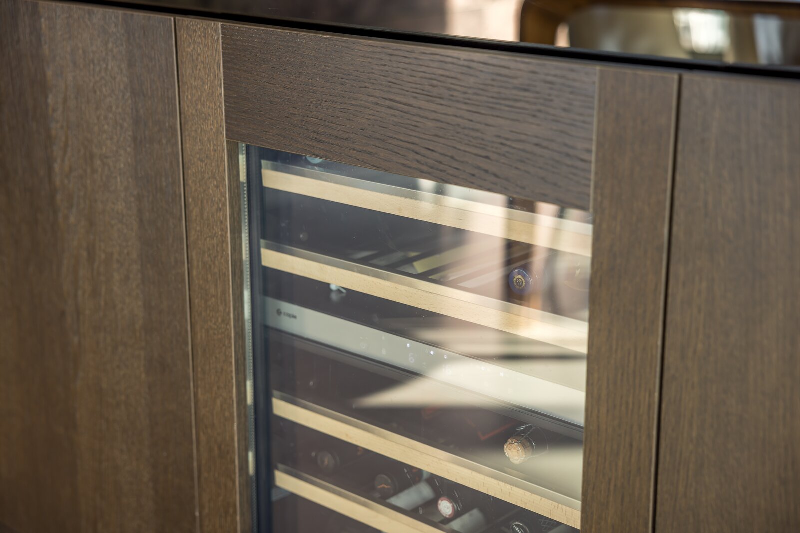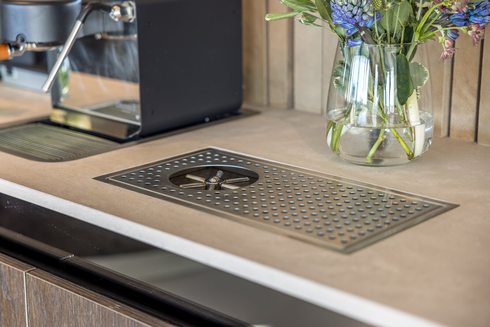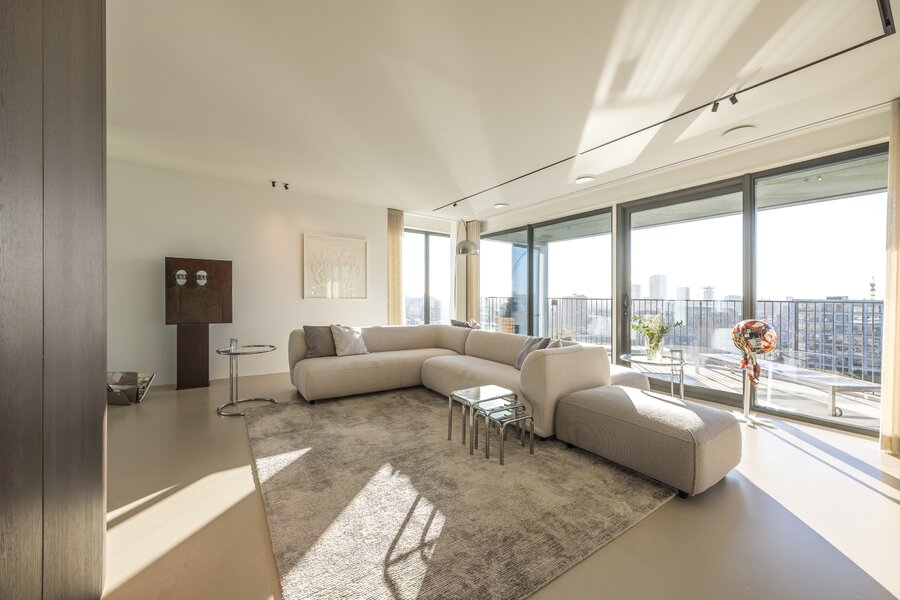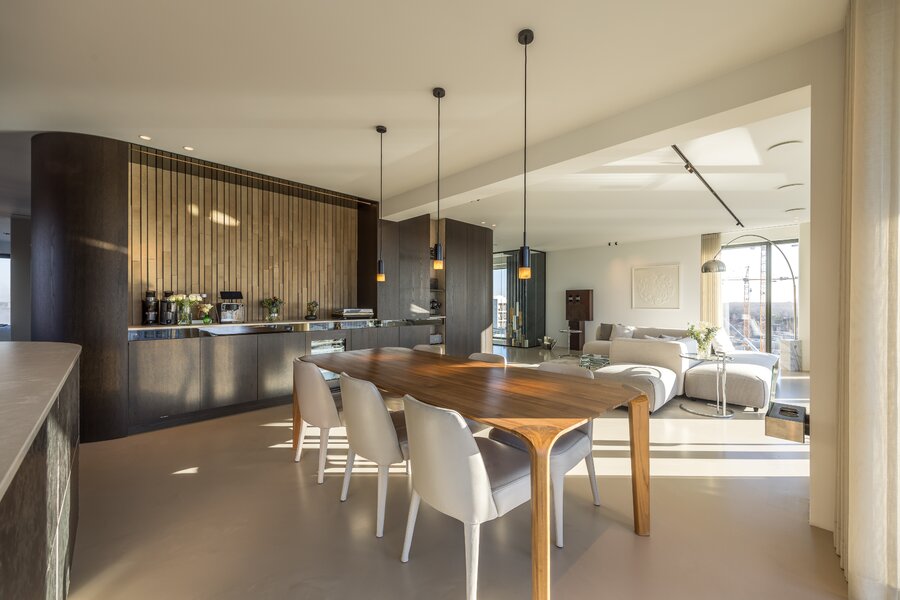Aan de rechterzijde ligt de maatwerk keuken, voorzien van exclusieve apparatuur van onder andere Gaggenau, Siemens, Quooker en Bora. De keuken vormt samen met de eettafel het hart van de woning en staat in open verbinding met de living. In de kern is een geïntegreerde koffiebar met Decent espressomachine en wijnklimaatkast gerealiseerd. Vanuit de royale woonkamer zorgen lange zichtlijnen en grote raampartijen voor een aangename lichtinval en uitzicht richting de stad. Het aangrenzende balkon op het zuidwesten vormt een verlengstuk van de leefruimte, ideaal voor lange avonden buiten.