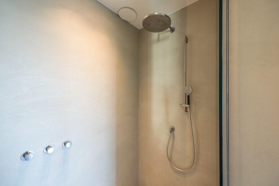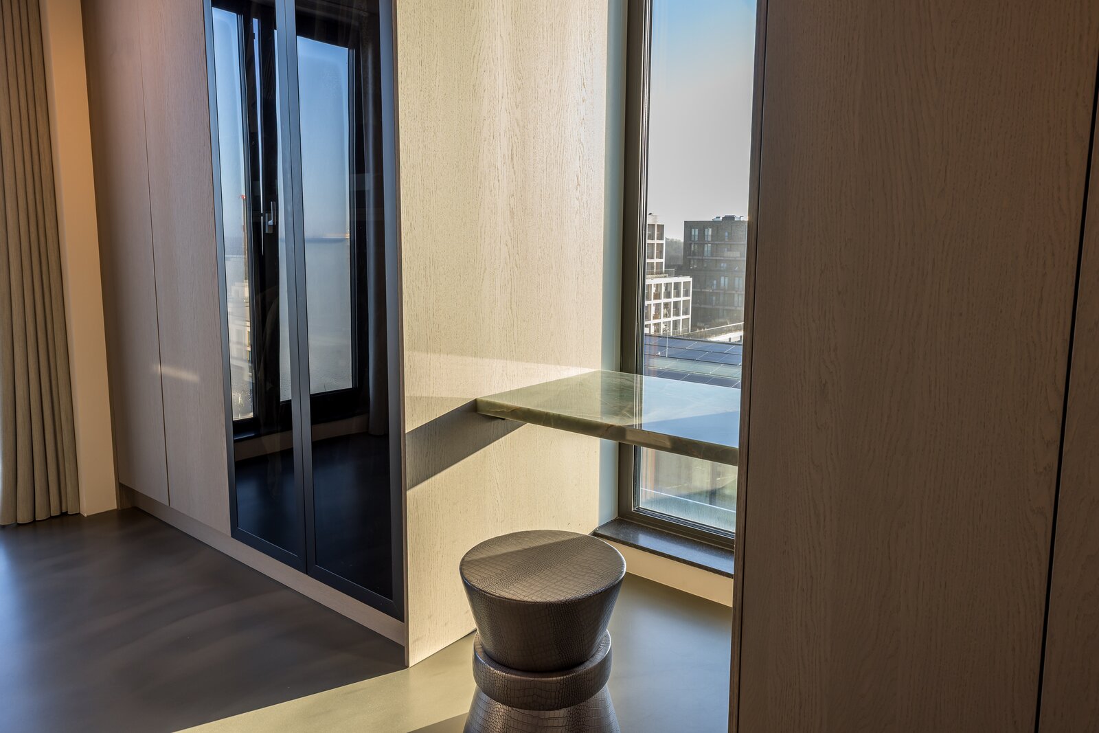 A private elevator grants access to the ninth floor, exclusively accessible with your personal lift key for complete privacy. Directly beside the elevator is the entrance to this loft-like floor, finished with poured floors. Opposite the entrance, the wardrobe is discreetly concealed behind a flush pivot door, with the technical room and utility space located behind it.