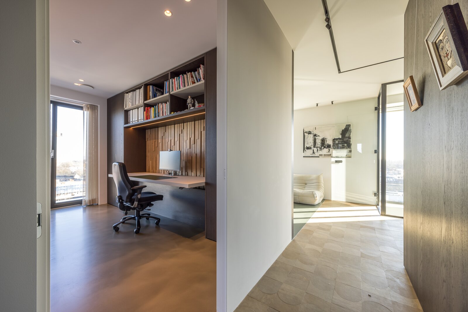 een separate toiletruimte met douchetoilet zorgvuldig geïntegreerd. Aan de noordoostzijde bevindt zich een ruime chillkamer met 75-inch televisie, perfect om te ontspannen. De gang, voorzien van subtiel lederen afwerking, leidt naar drie ruime slaapkamers, waarvan één momenteel in gebruik is als thuiswerkkantoor. Alle kamers zijn licht, rustig en comfortabel ingericht, met veel opbergruimte geïntegreerd in de maatwerk kastenwanden.