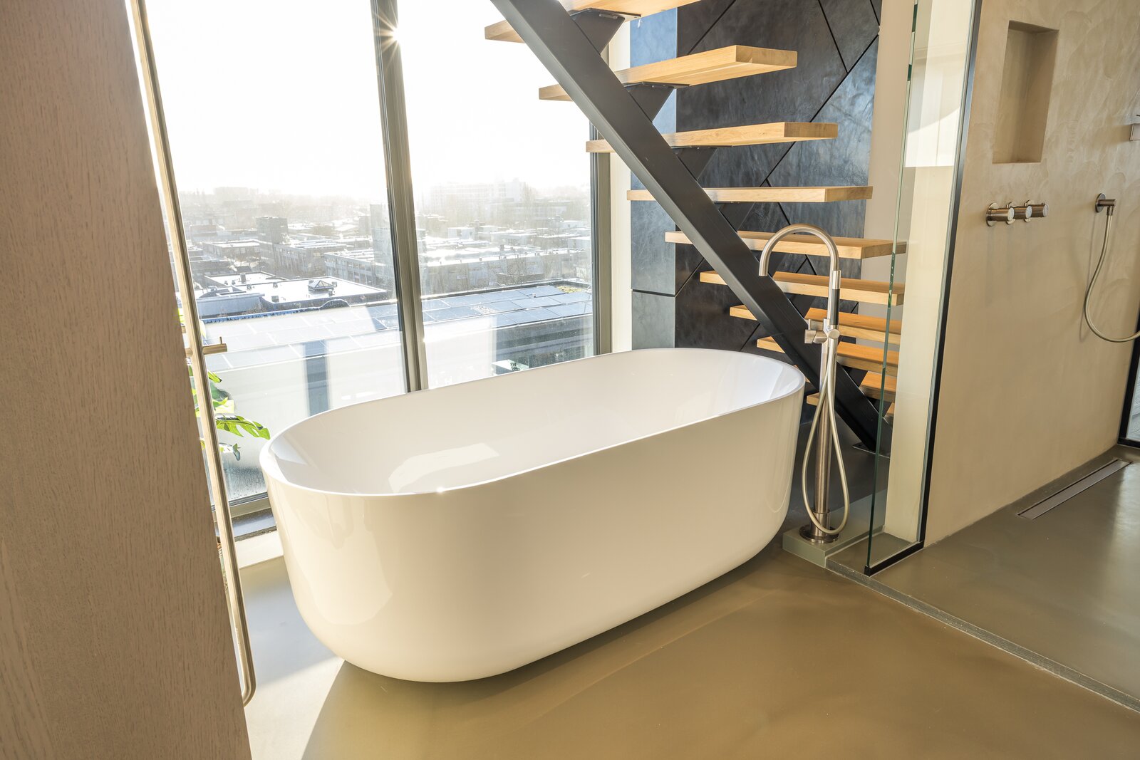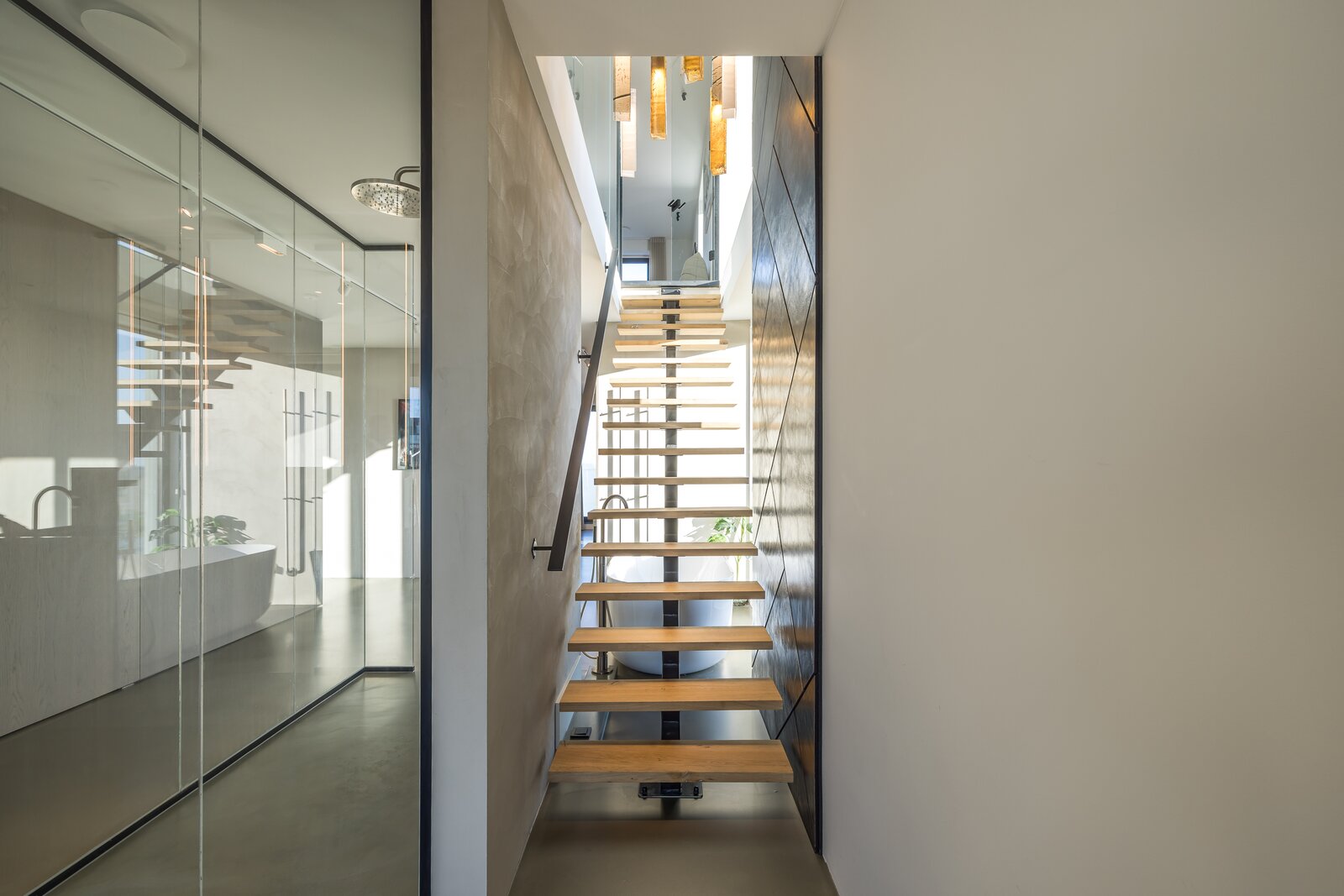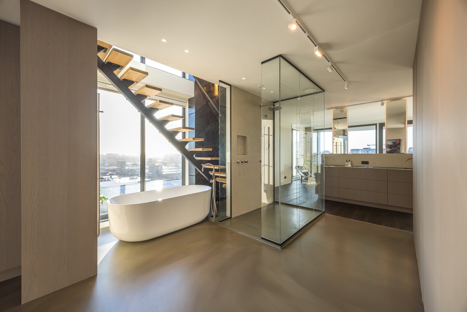 Centraal op deze verdieping bevindt zich het glazen trappenhuis, dat de verbinding vormt met de ondergelegen woonlaag en zorgt voor een prettige doorstroming van licht en ruimte.