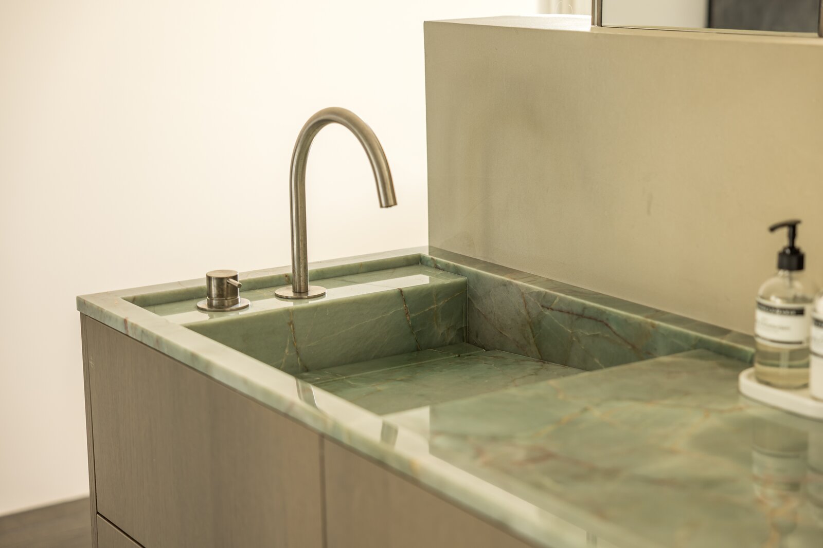 Additionally, this floor features a separate toilet, a spacious walk-in dressing room, a separate laundry room, and an extra bedroom, currently used as a nursery but also suitable as a gym or study. Here, poured floors and custom wooden cabinetry maintain a calm and cohesive aesthetic.