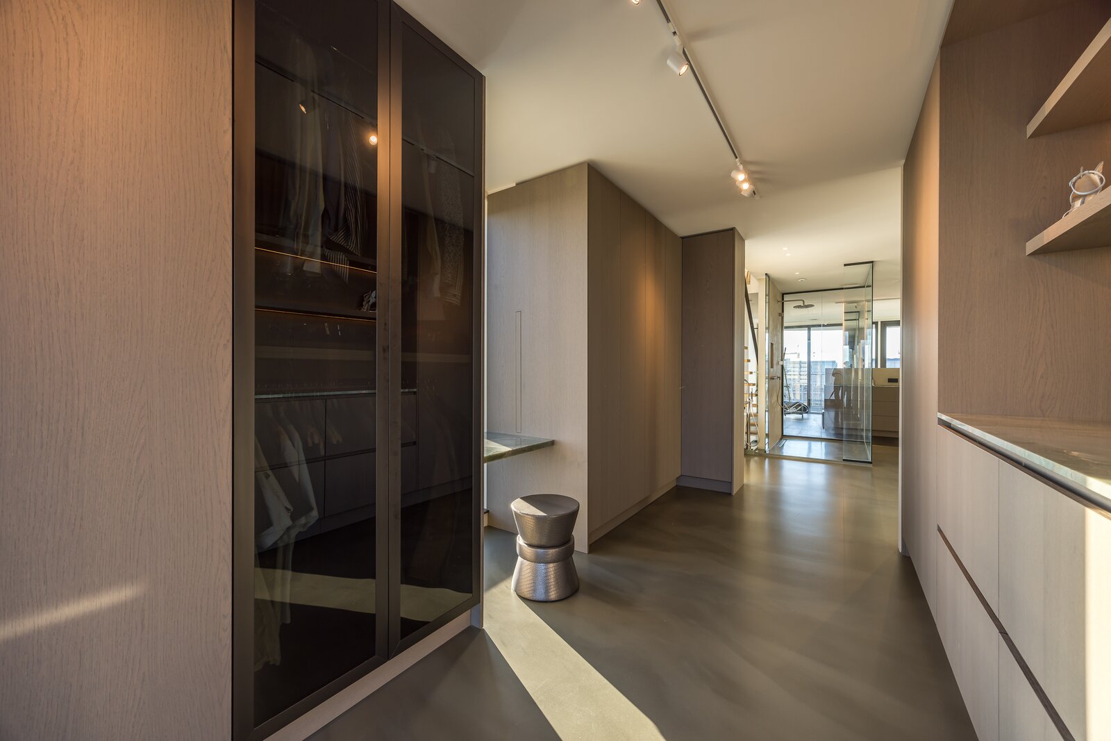 Via de privétoegankelijke lift bereikt u de negende verdieping, die uitsluitend toegankelijk is met uw eigen liftsleutel en volledige privacy biedt. Direct naast de lift bevindt zich de entree van deze loftachtige woonlaag, afgewerkt met gietvloeren. Tegenover de entree is de garderobe subtiel weggewerkt achter een blinde taatsdeur, met daarachter de technische ruimte en bijkeuken.