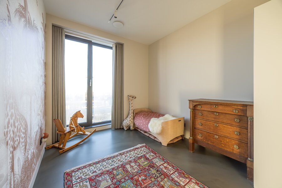Daarnaast bevinden zich op deze verdieping een separate toiletruimte, een ruime inloop kleedkamer, een aparte wasruimte en een extra slaapkamer, momenteel in gebruik als babykamer maar ook geschikt als gym of werkkamer. Ook hier zijn gietvloeren en houten maatwerk kasten te vinden, wat zorgt voor een rustige en samenhangende uitstraling.