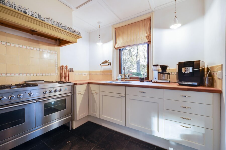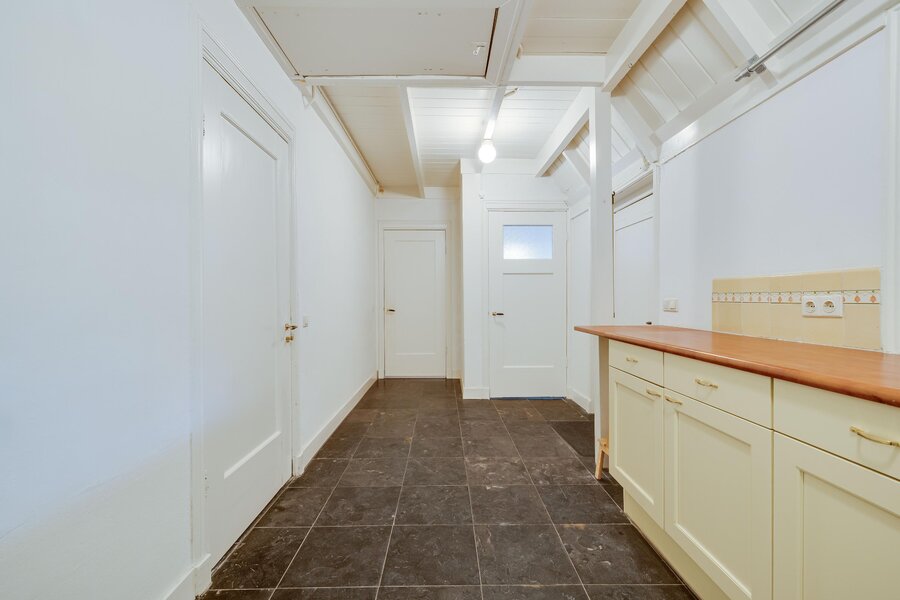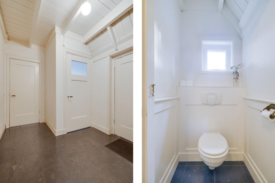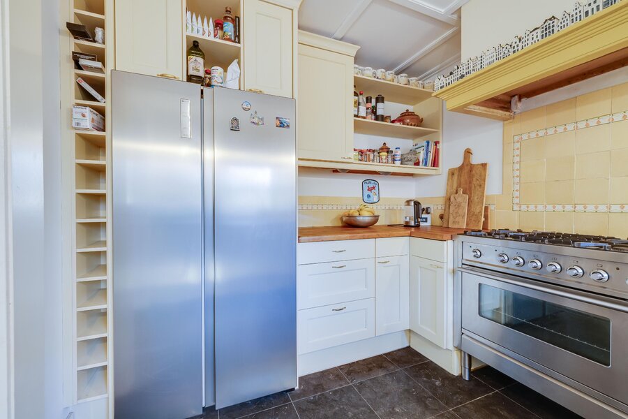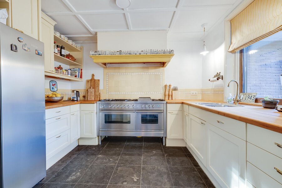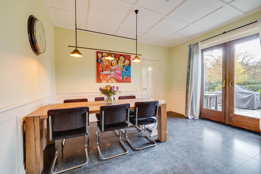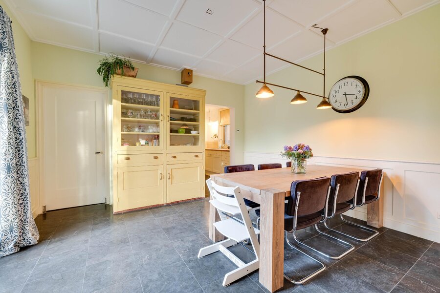 Vanaf de zitkamer bereikt u via mooie en suitedeuren de tweede living met erker en nieuwe houtkachel (2024). Aan de rechterzijde van de hal treft u de eetkamer, met openslaande deuren naar het terras en de aangrenzende halfopen keuken met fraai Boretti fornuis en Amerikaanse koelkast. De originele mosterdgele servieskast maakt deze eetkamer compleet. Aangrenzend is een ruime bijkeuken met spoelbak en meer werkruimte en een tweede toilet. Ook vanuit de bijkeuken is het terras bereikbaar. Over de gehele begane grond ligt vloerverwarming. Vanuit de bijkeuken is via een vlizotrap een kleine zolder bereikbaar waar de cv-ketel, alsmede de hybride warmtepomp zijn gepositioneerd. In de hal tussen de eetkamer en de zitkamer is de toegang tot de kelder op stahoogte. Tenslotte is er vanuit de bijkeuken toegang tot de inpandige garage of berging. De garage heeft ramen en openslaande deuren naar de voorzijde. De aangebouwde tweede garage is nog groter en heeft eveneens een achterdeur.