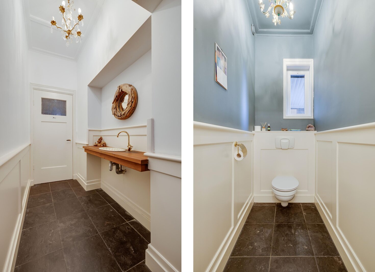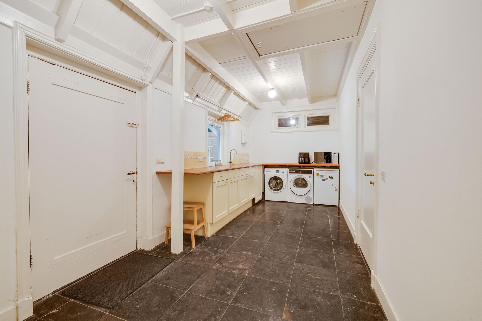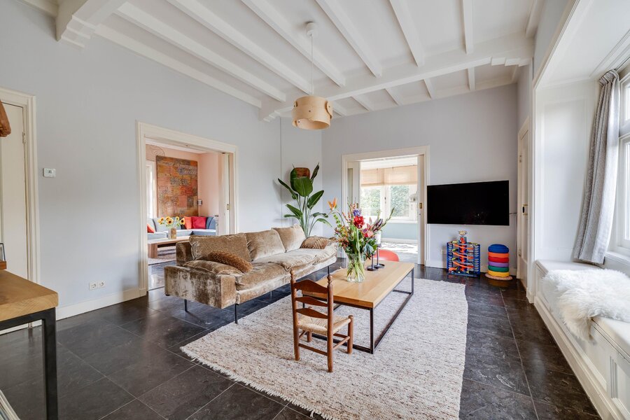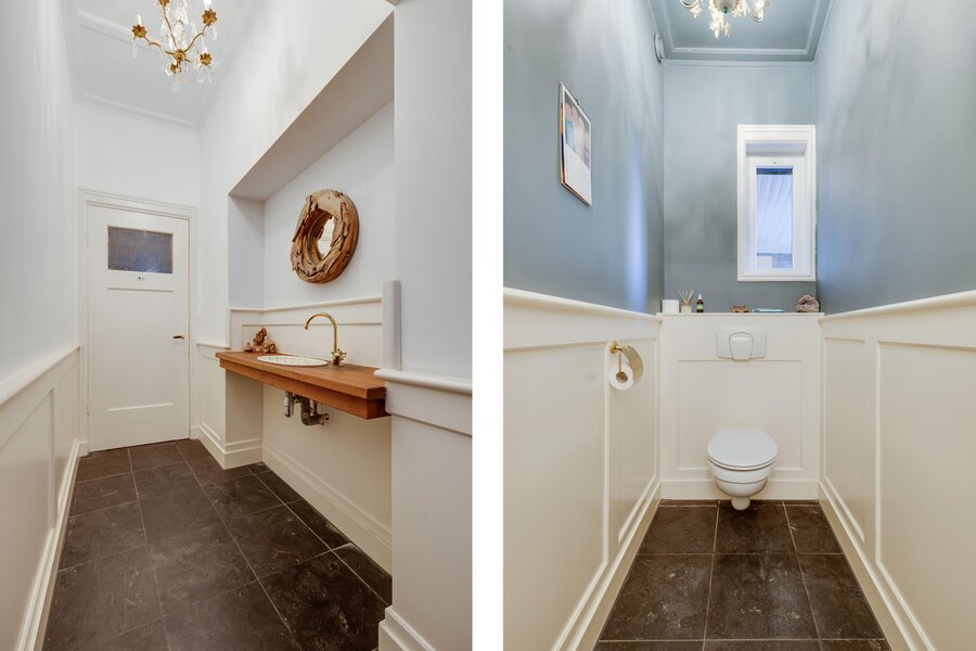Vanaf de zitkamer bereikt u via mooie en suitedeuren de tweede living met erker en nieuwe houtkachel (2024). Aan de rechterzijde van de hal treft u de eetkamer, met openslaande deuren naar het terras en de aangrenzende halfopen keuken met fraai Boretti fornuis en Amerikaanse koelkast. De originele mosterdgele servieskast maakt deze eetkamer compleet. Aangrenzend is een ruime bijkeuken met spoelbak en meer werkruimte en een tweede toilet. Ook vanuit de bijkeuken is het terras bereikbaar. Over de gehele begane grond ligt vloerverwarming. Vanuit de bijkeuken is via een vlizotrap een kleine zolder bereikbaar waar de cv-ketel, alsmede de hybride warmtepomp zijn gepositioneerd. In de hal tussen de eetkamer en de zitkamer is de toegang tot de kelder op stahoogte. Tenslotte is er vanuit de bijkeuken toegang tot de inpandige garage of berging. De garage heeft ramen en openslaande deuren naar de voorzijde. De aangebouwde tweede garage is nog groter en heeft eveneens een achterdeur.