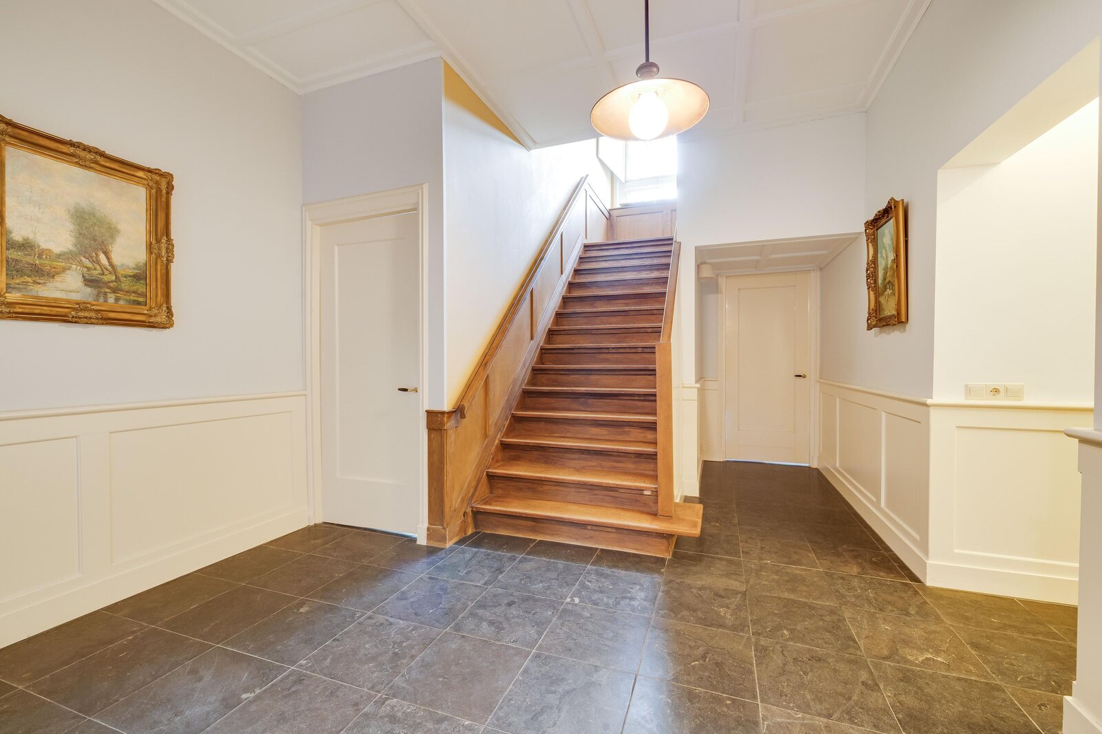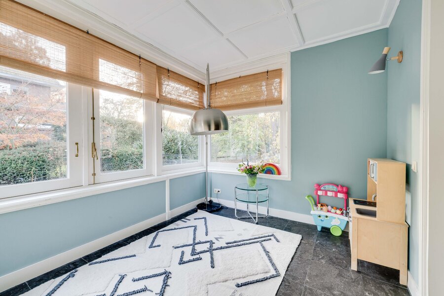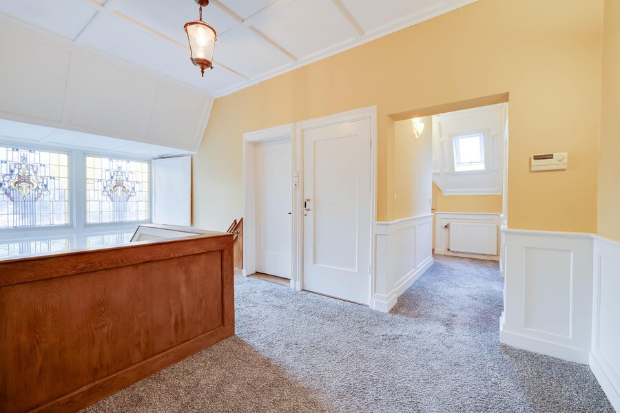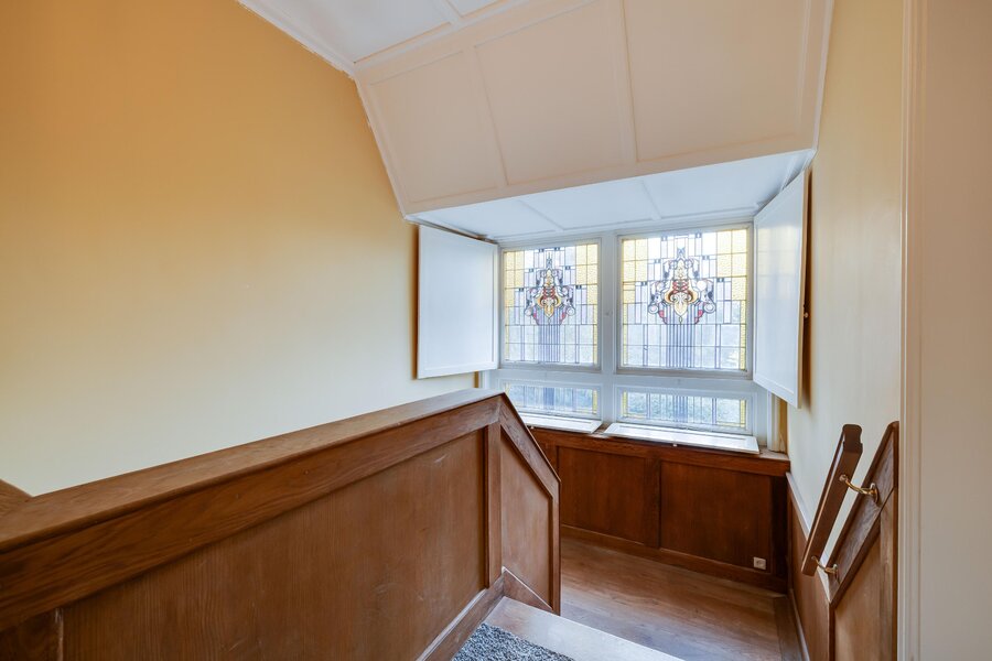 De bijzondere architectuur, met bijvoorbeeld de gebrandschilderde glas-in-loodramen op het trapbordes van atelier Bogtman uit Haarlem, bleef bewaard en werd verfraaid met een massief eiken trap met lambrisering naar de eerste verdieping. Vanaf deze verdieping gaat een vaste trap naar de royale geïsoleerde zolderverdieping. De zolder biedt dus mogelijkheden voor uitbreiding van het gebruiksoppervlak wonen. De woning is geen monument, dus veranderingen zijn mogelijk.