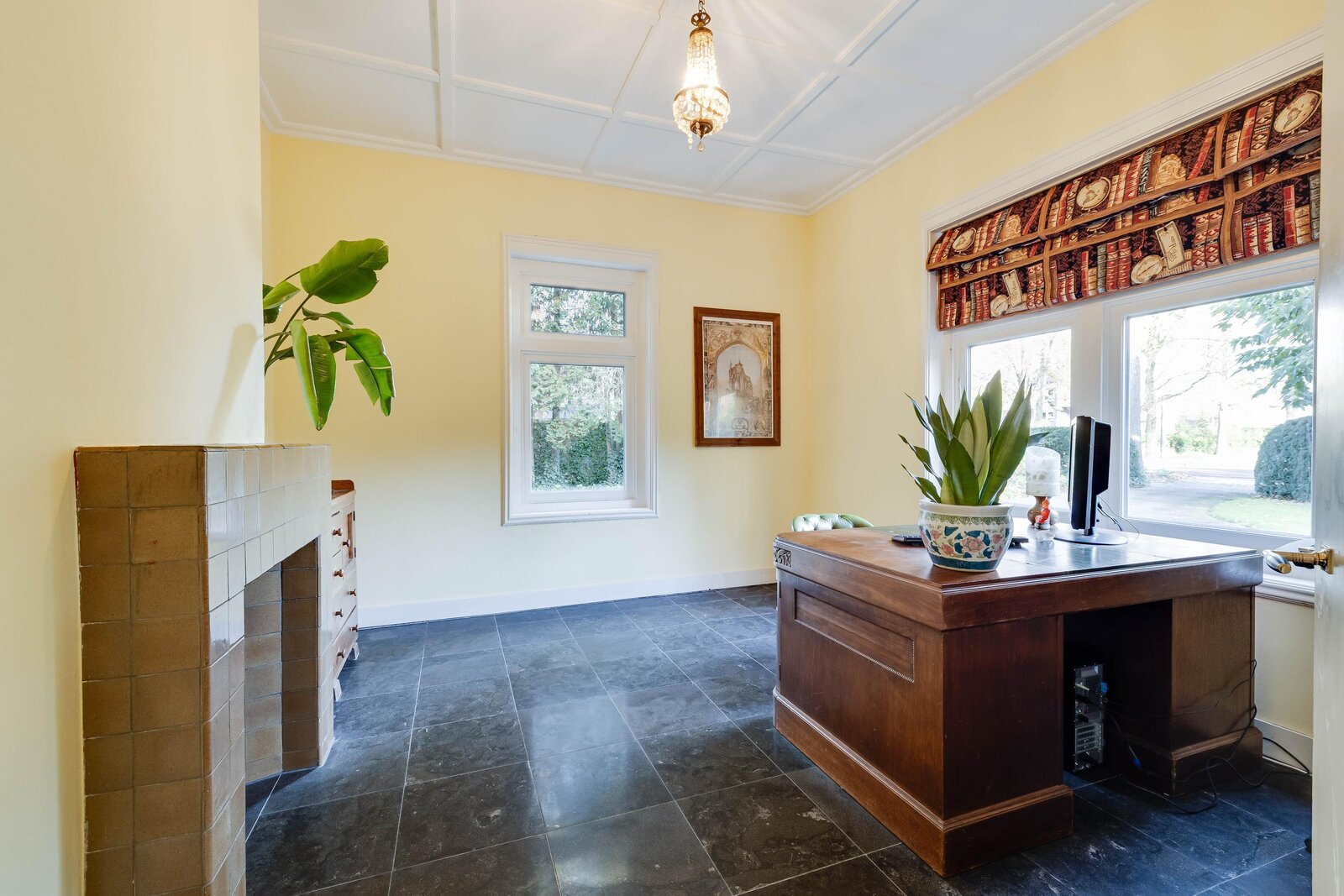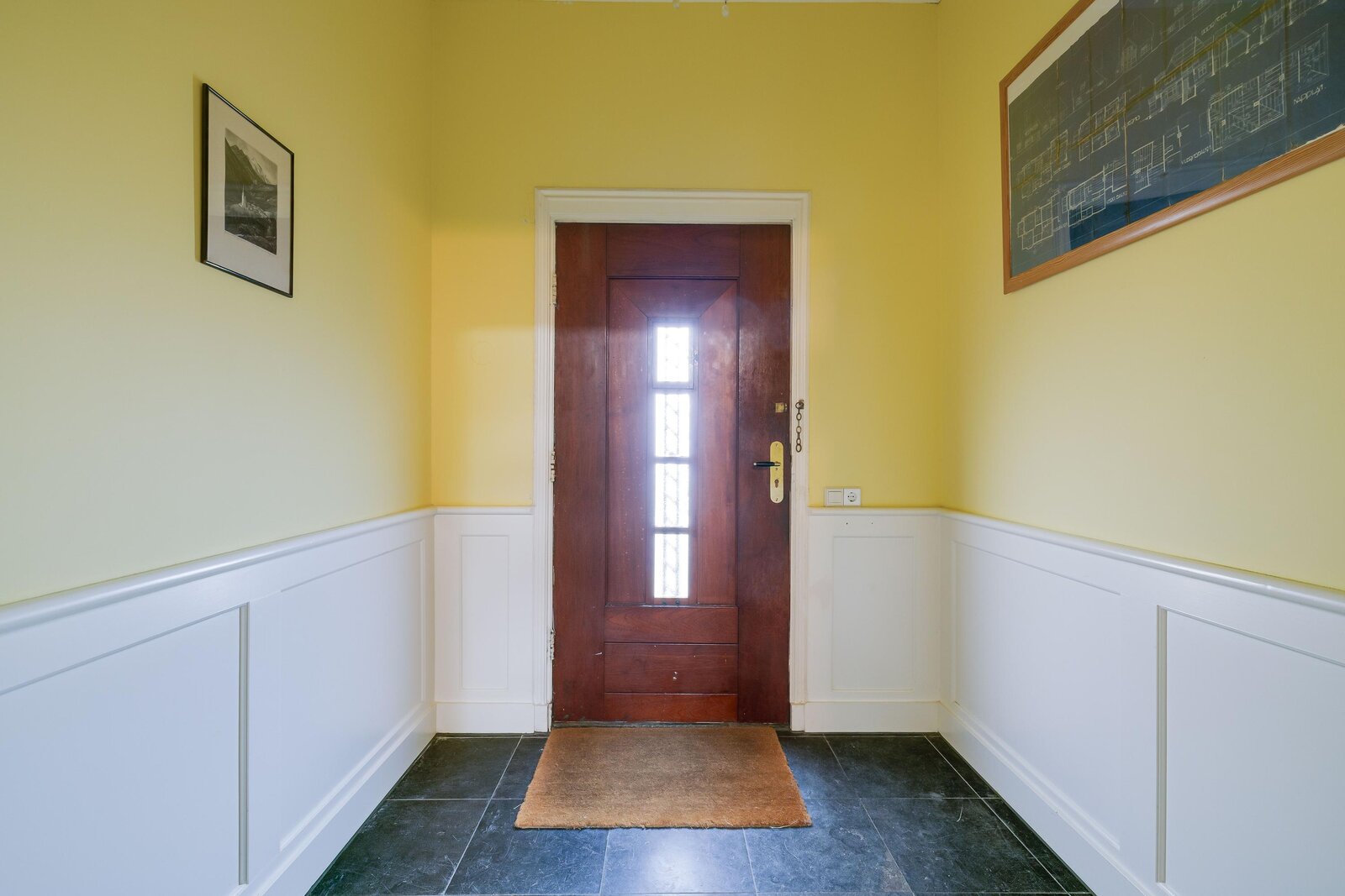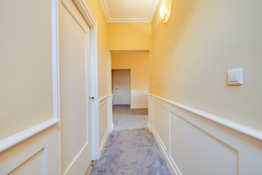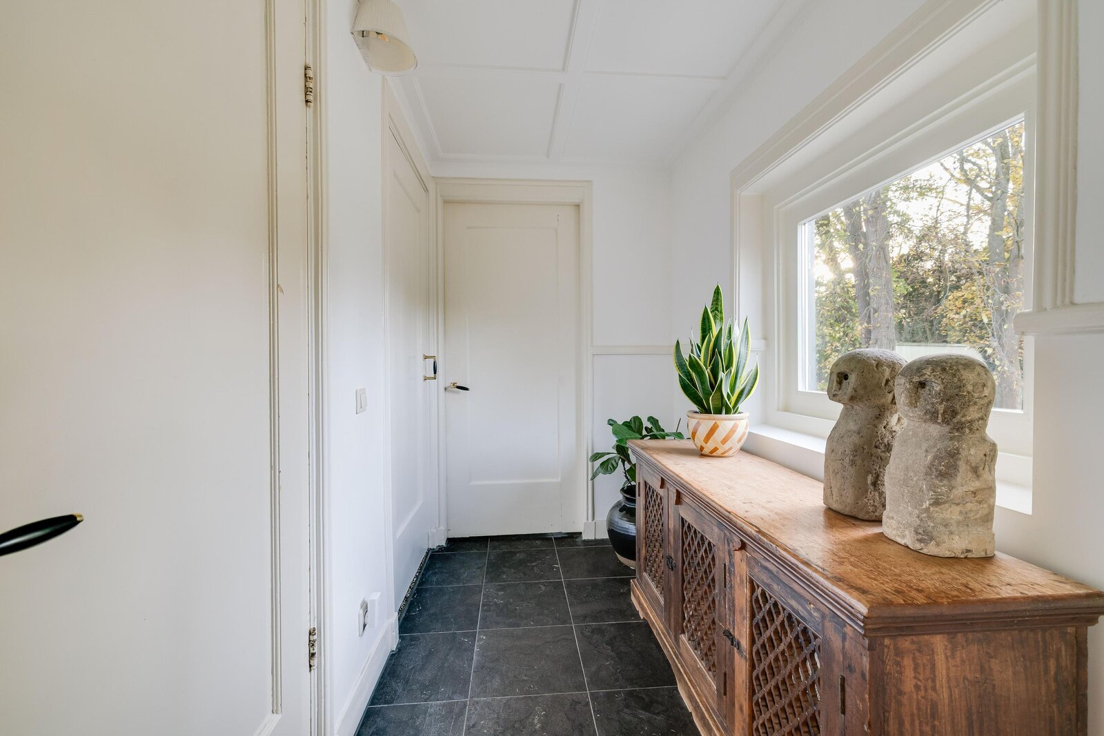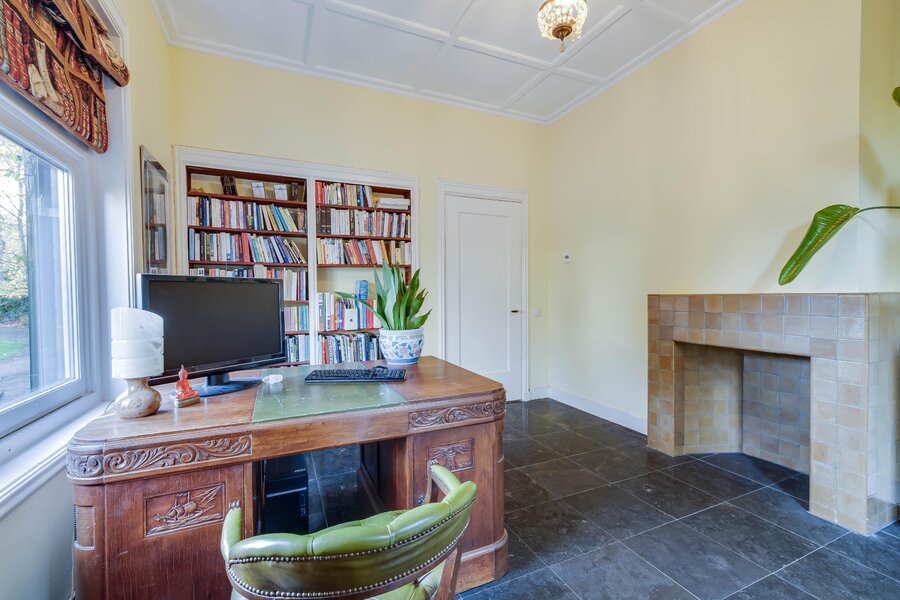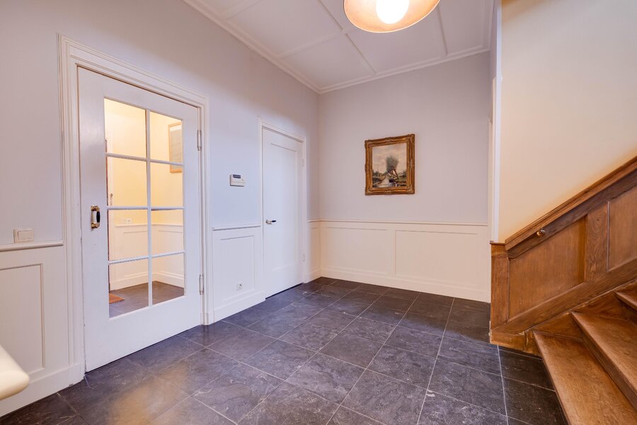 Originele voordeur, vestibule, ruime hal met trappartij en zicht op de gebrandschilderde glas-in-loodramen, separate garderoberuimte met 3 kleine glas-in-loodramen, toilet met separaat wastafelmeubel in halletje en aan de rechterzijde de herenkamer (kantoor en/of praktijkruimte). Aan de linkerzijde is toegang tot de royale zitkamer met hoog plafond, ruime (zit)vensterbank en aangrenzend (gescheiden door dubbele en-suitedeuren), de lichte serre met openslaande deuren naar het terras aan de zijkant van het huis.