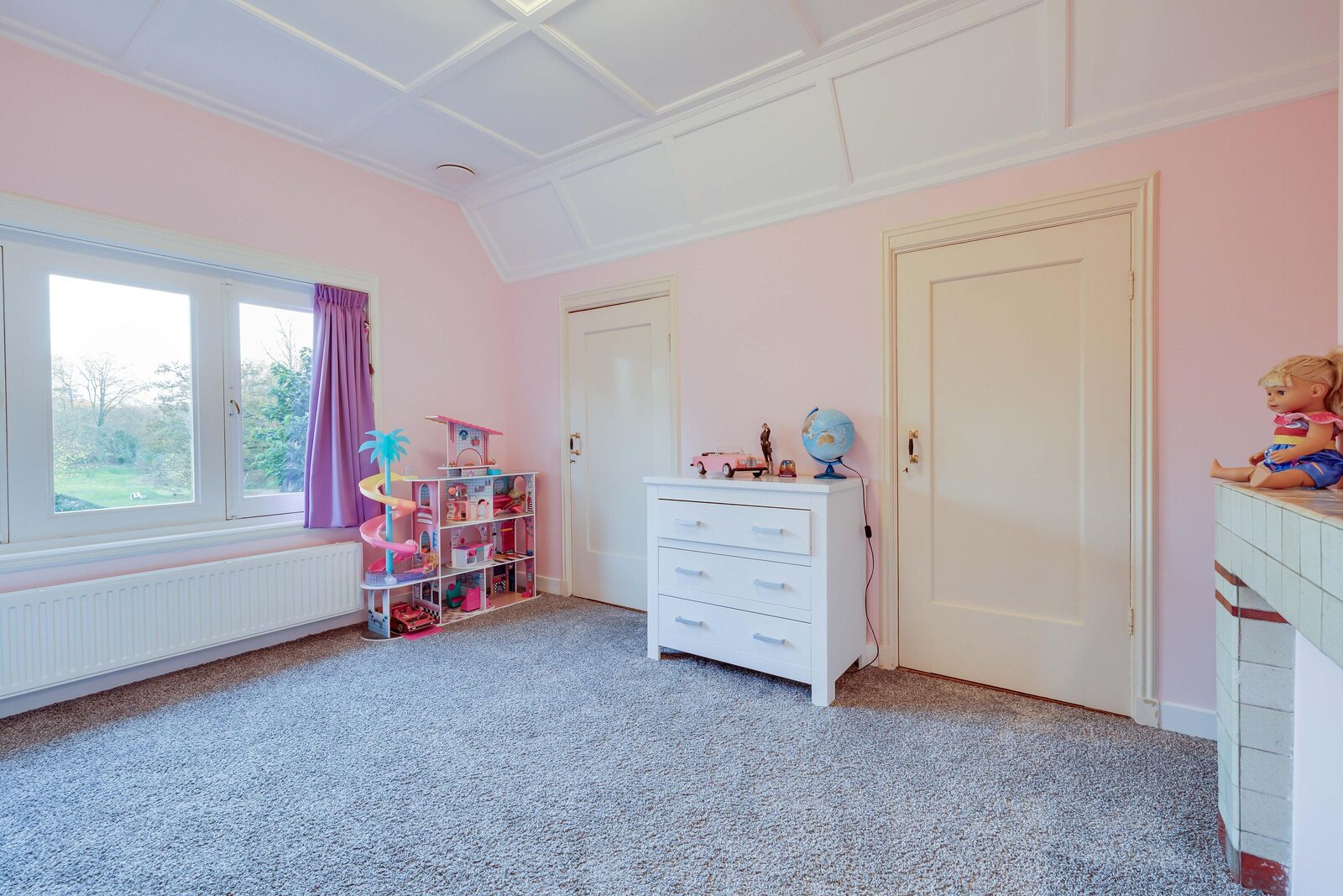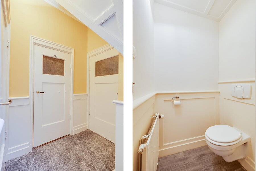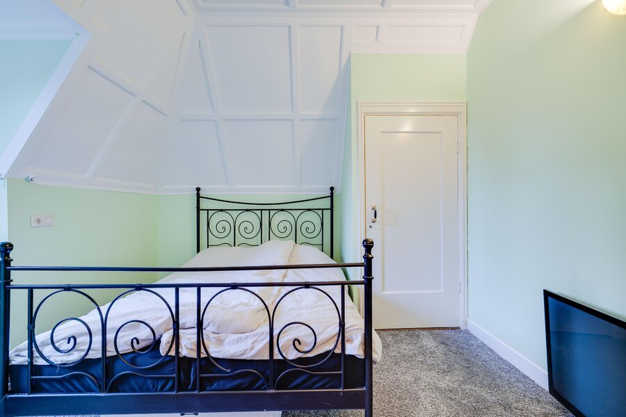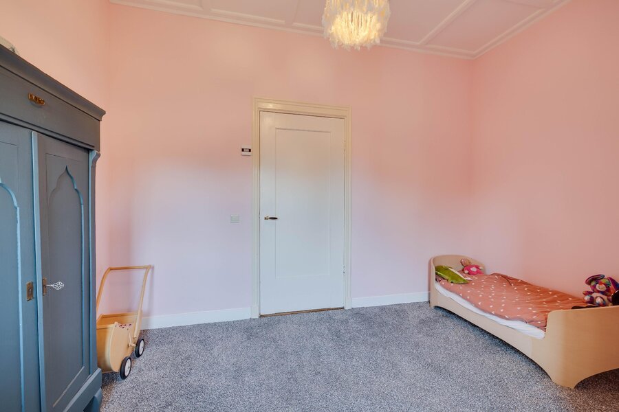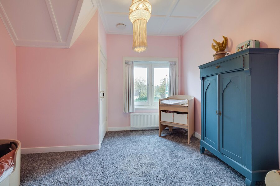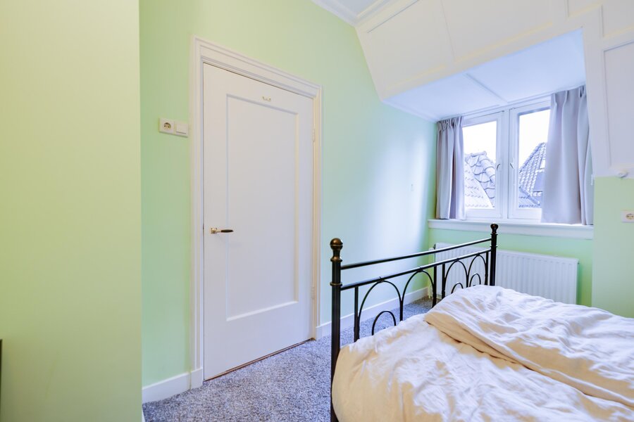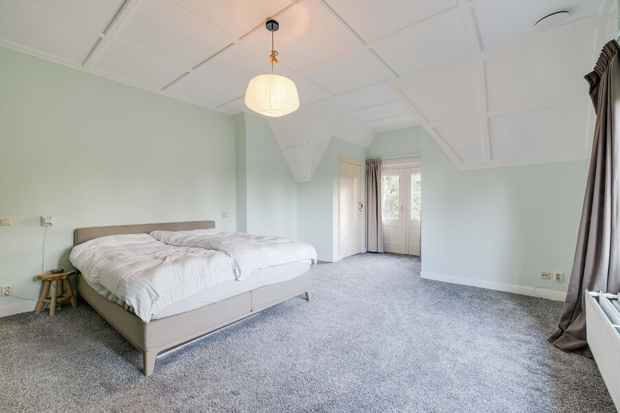 via het eiken trappenhuis met bordes bereikt u de overloop. Daaraan gesitueerd zijn de badkamer met ligbad, douche en dubbele wastafel en 5 slaapkamers. De master bedroom aan de achterzijde van de woning is royaal, heeft een prachtig zicht op de tuin en openslaande deuren naar een balkon. Er zijn twee vaste kasten. De tweede en derde slaapkamer (met vaste kasten) liggen aan de voorzijde: één ervan heeft een schouw en wastafel, en beide hebben een heerlijke ochtendzon. Slaapkamer 4 is een fijne kamer aan de zijkant van het huis, eveneens met een vaste kast. Slaapkamer 5 was vroeger de dienstbodekamer. Aan de gang ligt ook een toilet en nog twee vaste kasten. Middels een vaste trap is er tenslotte toegang tot de ruime geïsoleerde zolder op de tweede verdieping.