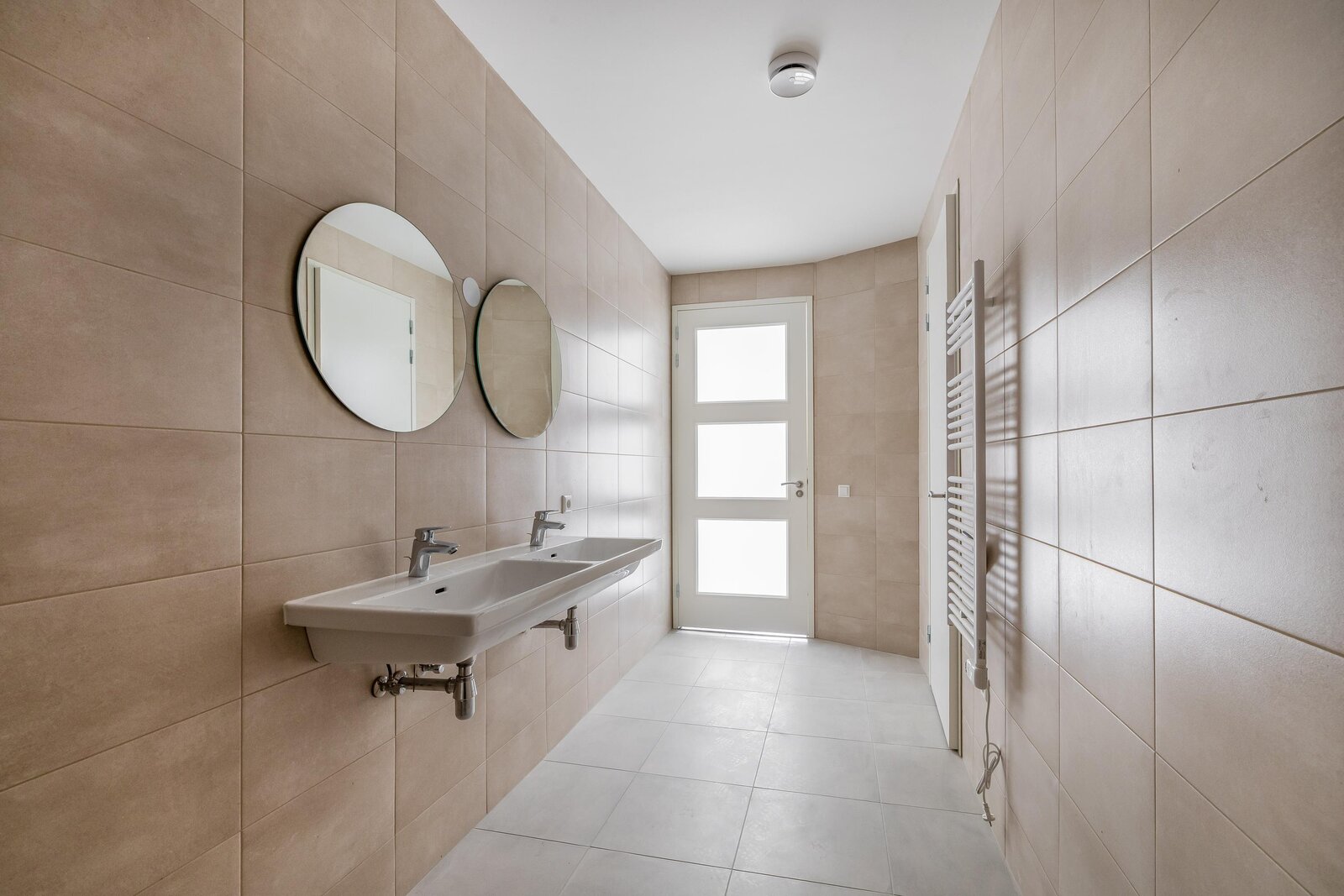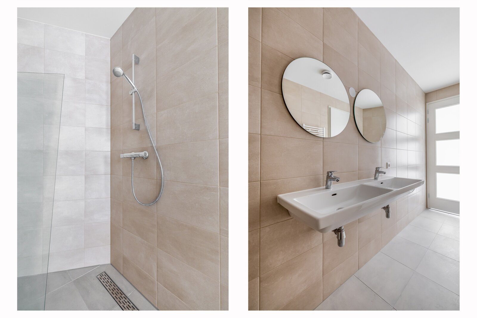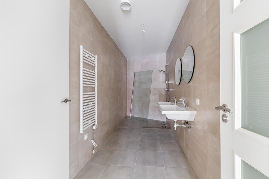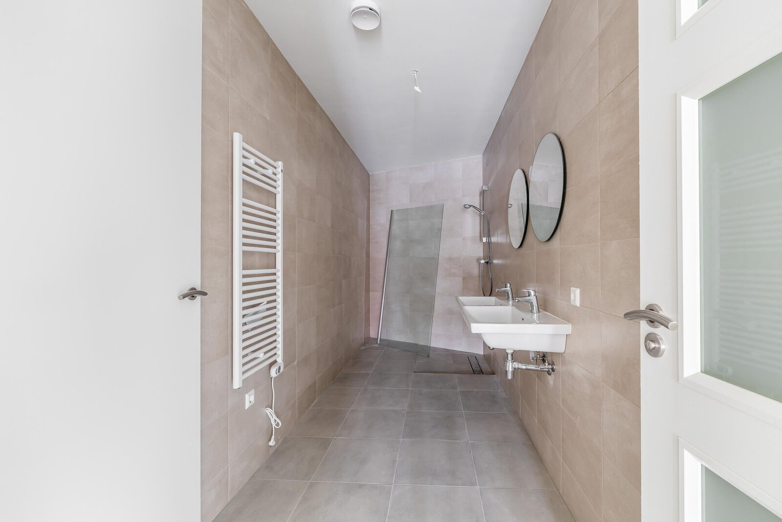 De badkamer is strak en modern afgewerkt en voorzien van een dubbele wastafel, inloopdouche en designradiator.