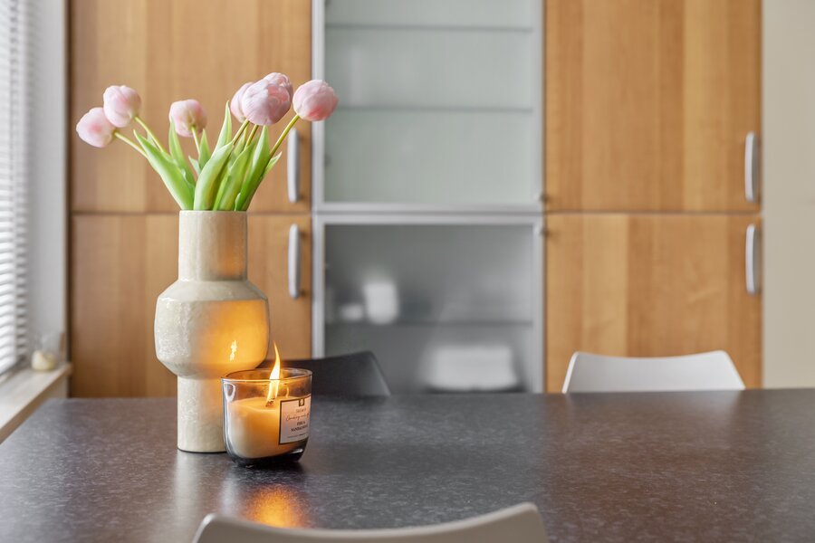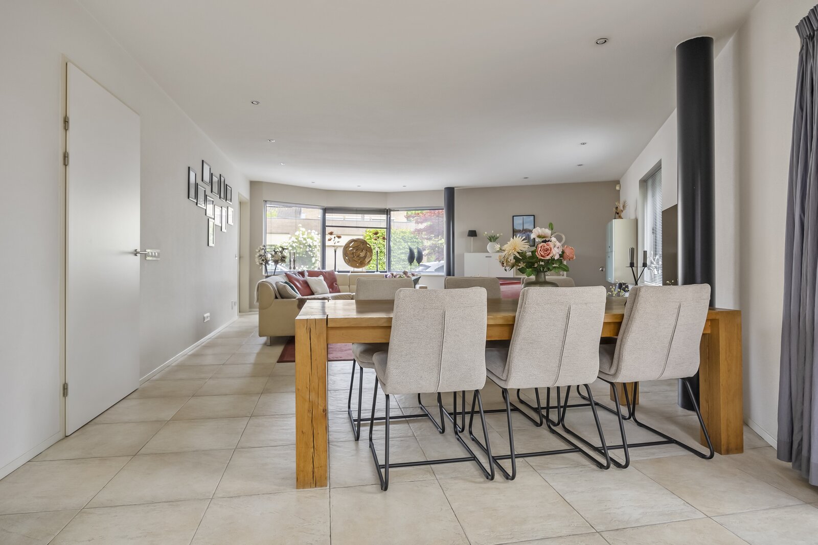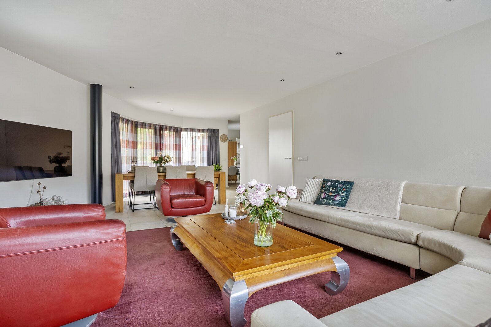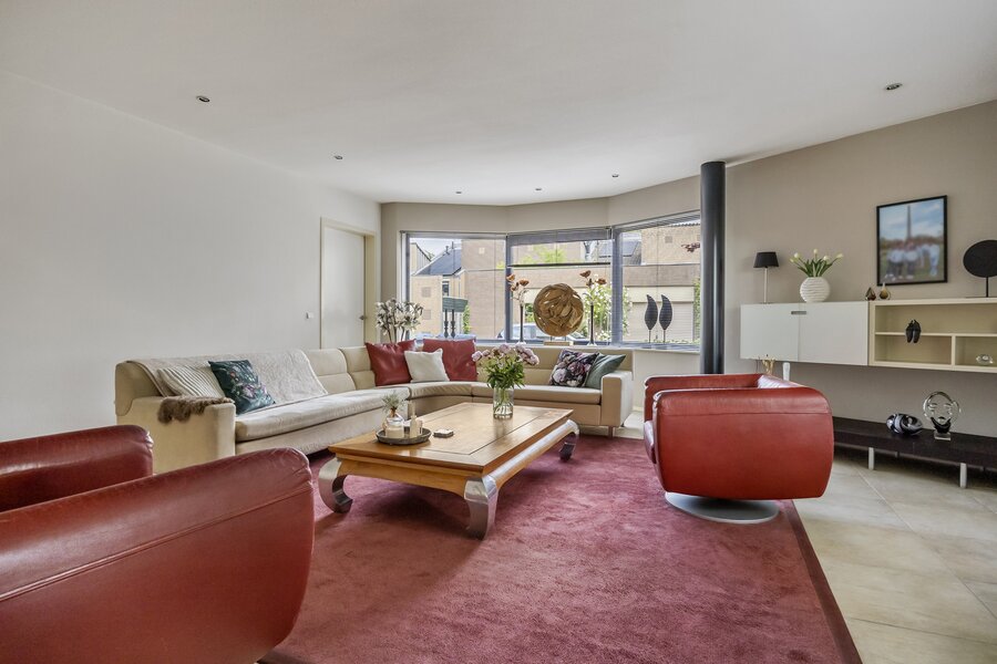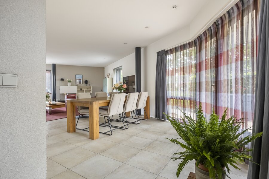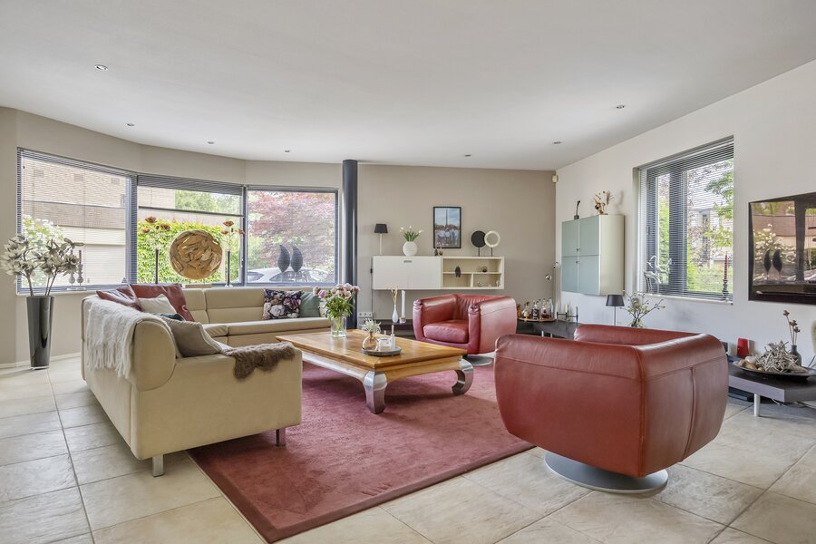 De ruime woonkamer vormt het kloppend hart van de woning. Grote, indrukwekkende raampartijen zorgen voor een overvloed aan daglicht en geven het interieur een open en luchtige uitstraling. De strakke inrichting wordt prachtig aangevuld door warme kleuraccenten, wat zorgt voor een perfecte balans tussen modern design en huiselijke sfeer.