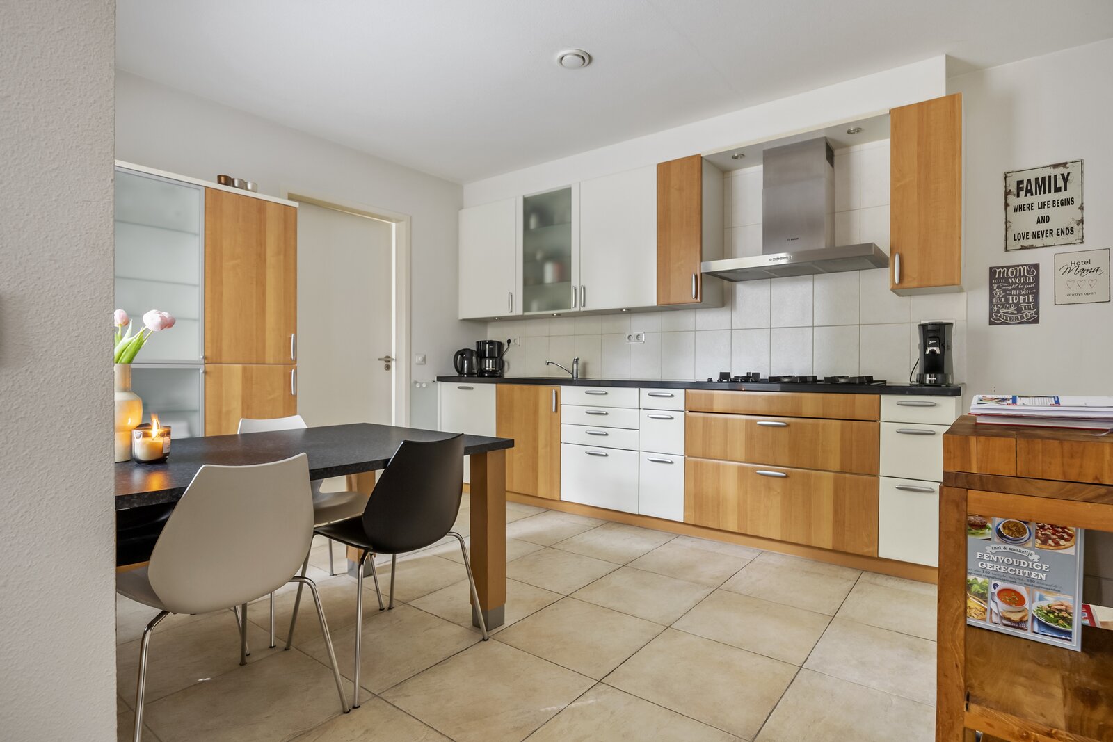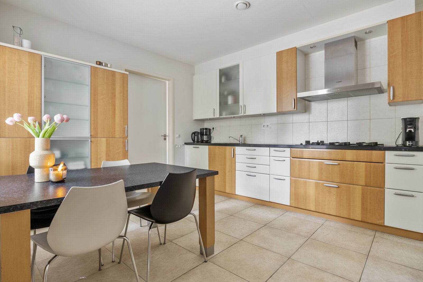 De keuken is uitgerust met alle benodigde inbouwapparatuur, waaronder een gaskookplaat, roestvrijstalen afzuigkap, combi-oven, koelkast en vaatwasser. Dankzij de vele kasten en lades is er meer dan voldoende opbergruimte voor kookgerei, servies en voorraad.
