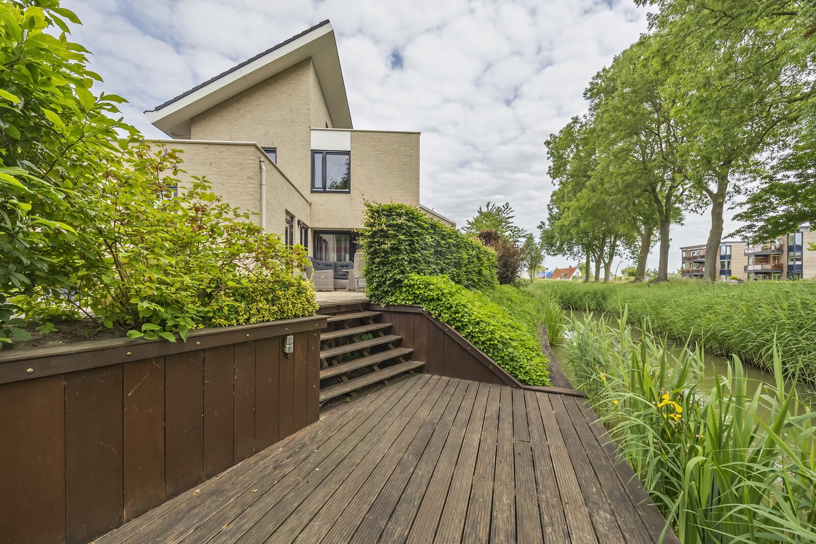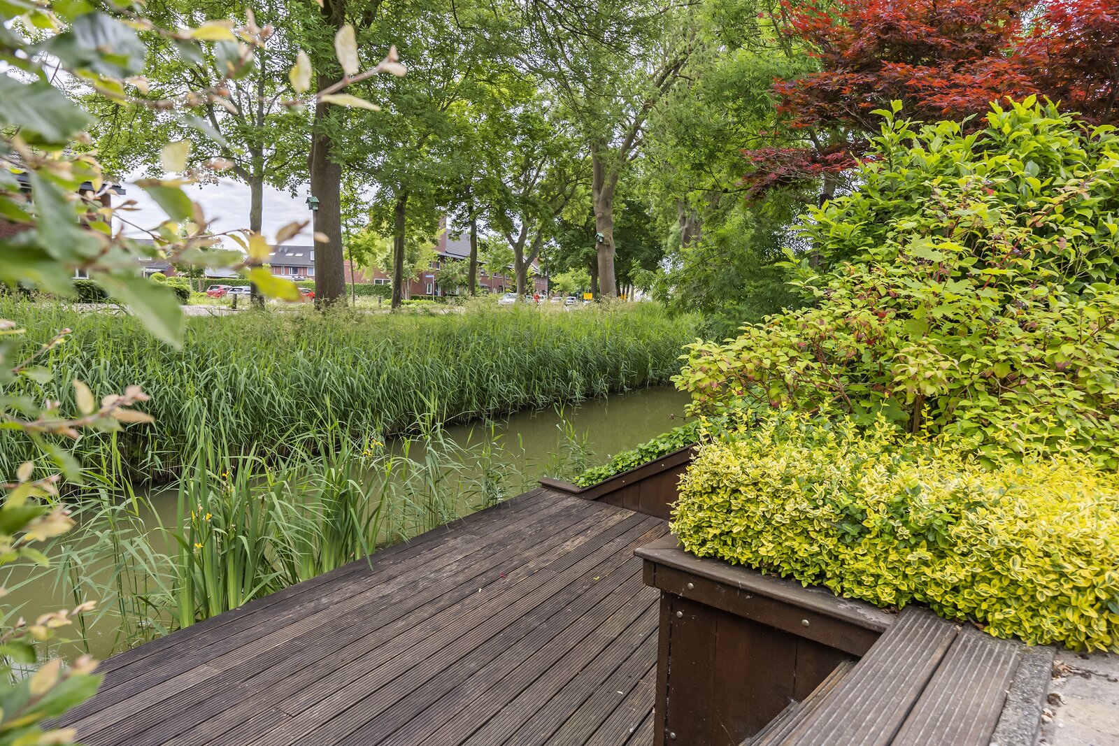 De woning staat op een ruime driehoekige kavel van maar liefst 610 m², met rondom tuin en buitenruimte. De voortuin is verzorgd aangelegd en loopt over in een fijne zijtuin op het oosten, waar je de ochtendzon vangt op het terras of het sfeervolle vlonderterras aan de watergang – een unieke plek om in alle rust te genieten van het buitenleven.