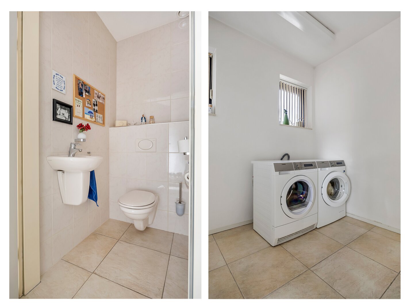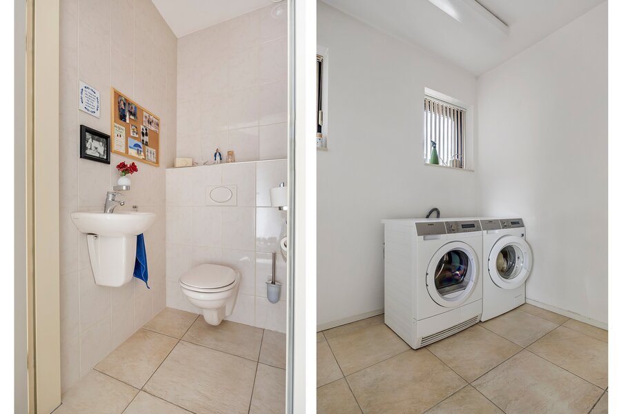 Grenzend aan de keuken bevindt zich een royale bijkeuken met aansluitingen voor wasmachine en droger. Hier vind je ook een tweede toilet en toegang tot zowel de tuin als de inpandige garage – ideaal voor dagelijks gebruik en extra comfort.