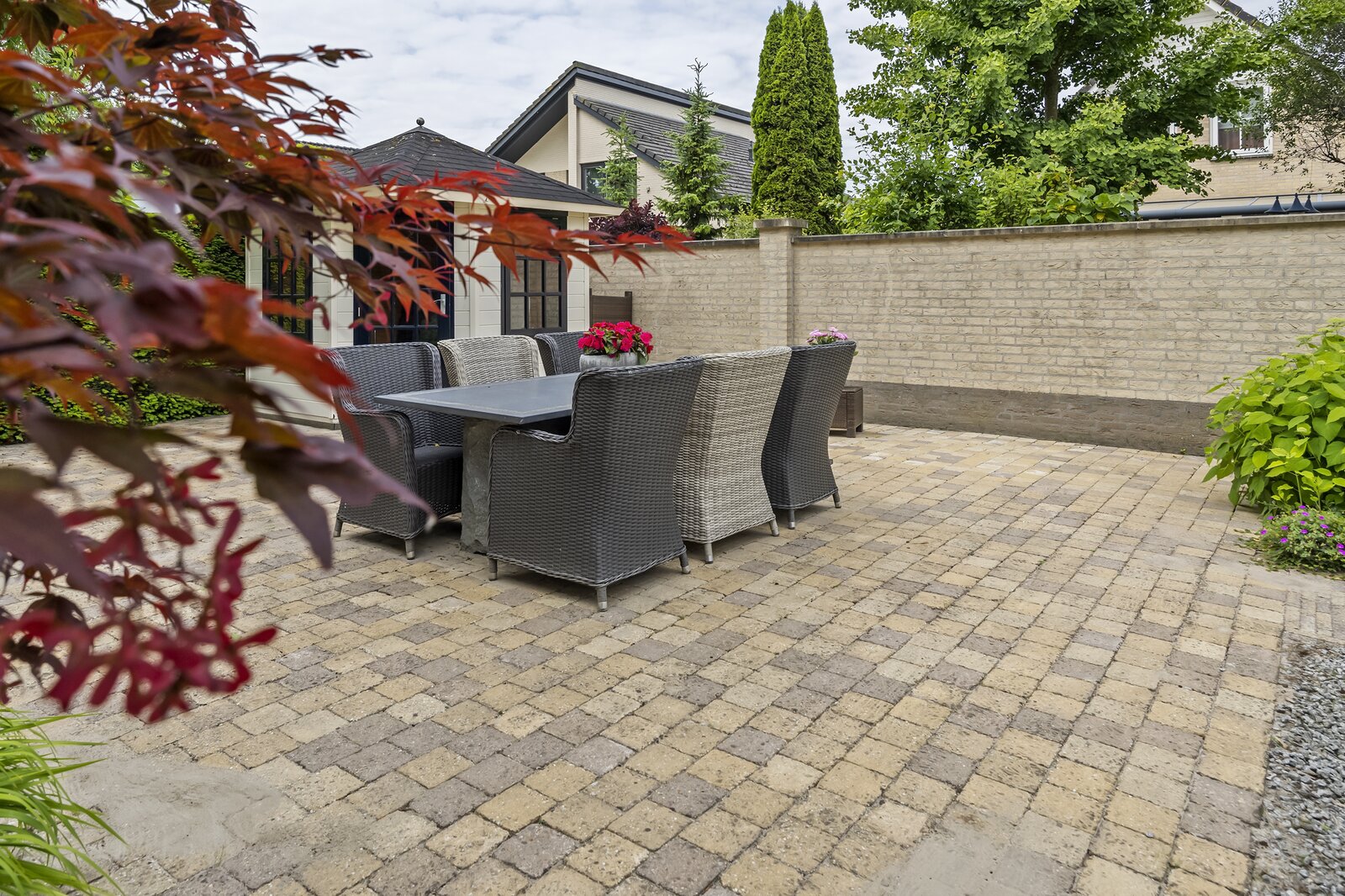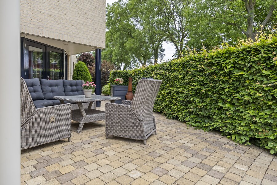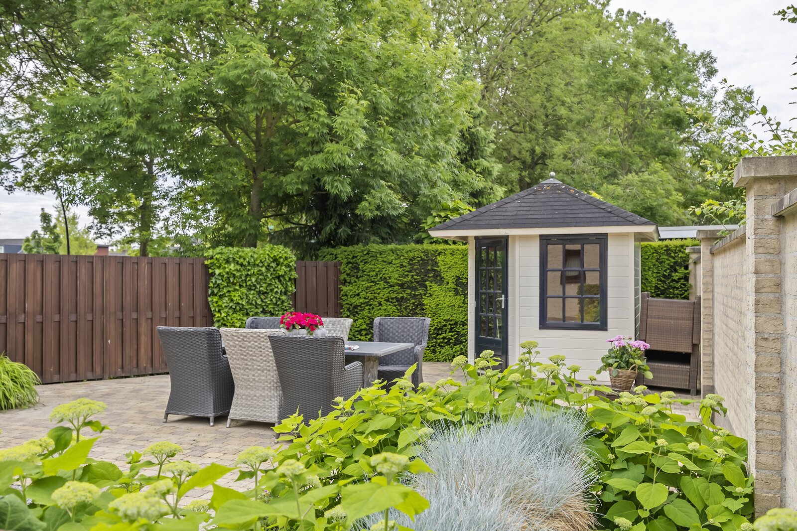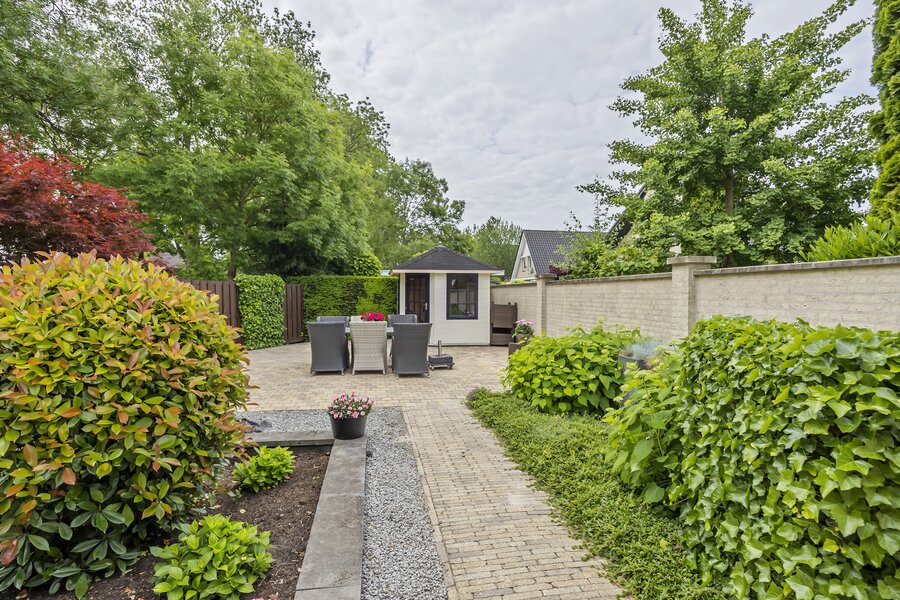 De achtertuin is circa 16 meter diep en fraai aangelegd met strakke bestrating van getrommelde stenen, borders met diverse beplanting én achterin een houten berging in blokhutstijl. Dankzij de hoge groene hagen, de ligging aan de watergang aan de oostzijde en een gemetselde tuinmuur aan de westzijde, biedt deze tuin bijzonder veel privacy en beschutting. Een heerlijke buitenruimte waar rust, ruimte en zon samenkomen.