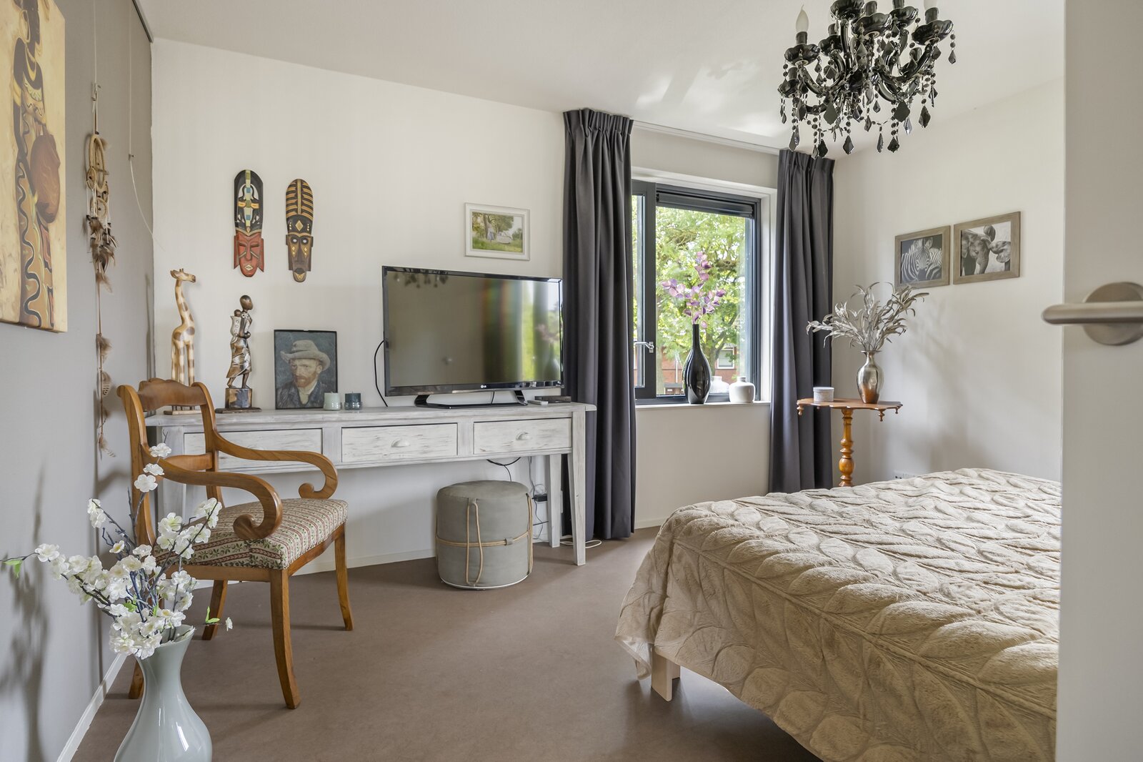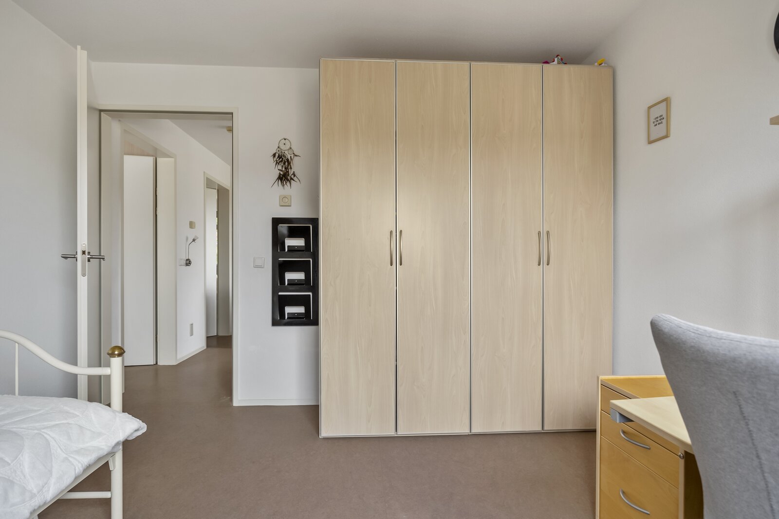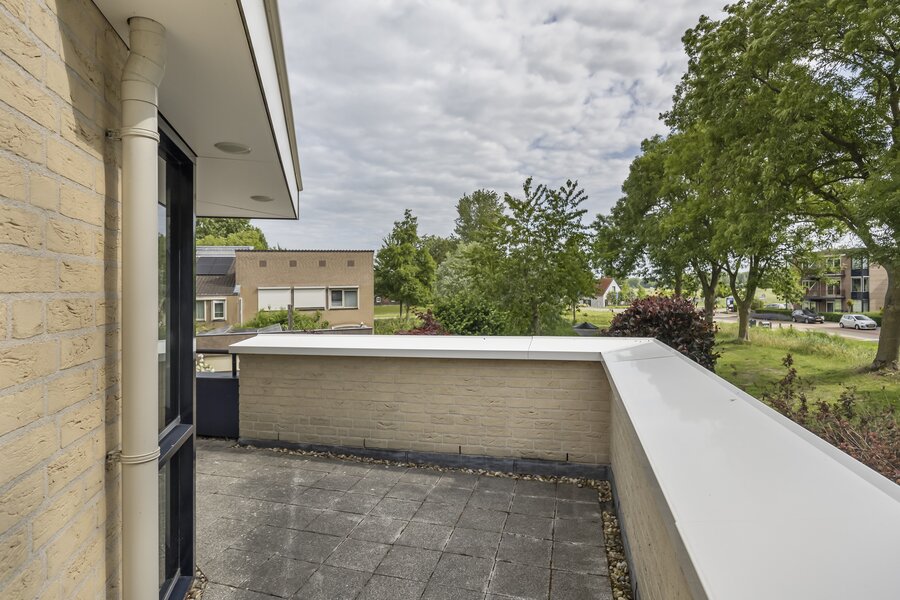 De overloop wordt fraai verlicht door een groot raam in de zijgevel, wat zorgt voor een lichte en open sfeer. Op de eerste verdieping bevinden zich drie ruim bemeten slaapkamers. De masterbedroom springt eruit door zijn speelse indeling, royale lichtinval via meerdere ramen en karakteristieke ronde vormen. Op maat gemaakte kastruimte biedt praktische opbergruimte, terwijl de openslaande deur toegang geeft tot een heerlijk dakterras – een fijne plek om je even terug te trekken. De gehele verdieping is afgewerkt met stijlvol marmoleum, dat niet alleen een comfortabele basis biedt, maar ook bekendstaat om zijn onderhoudsvriendelijke en duurzame karakter.