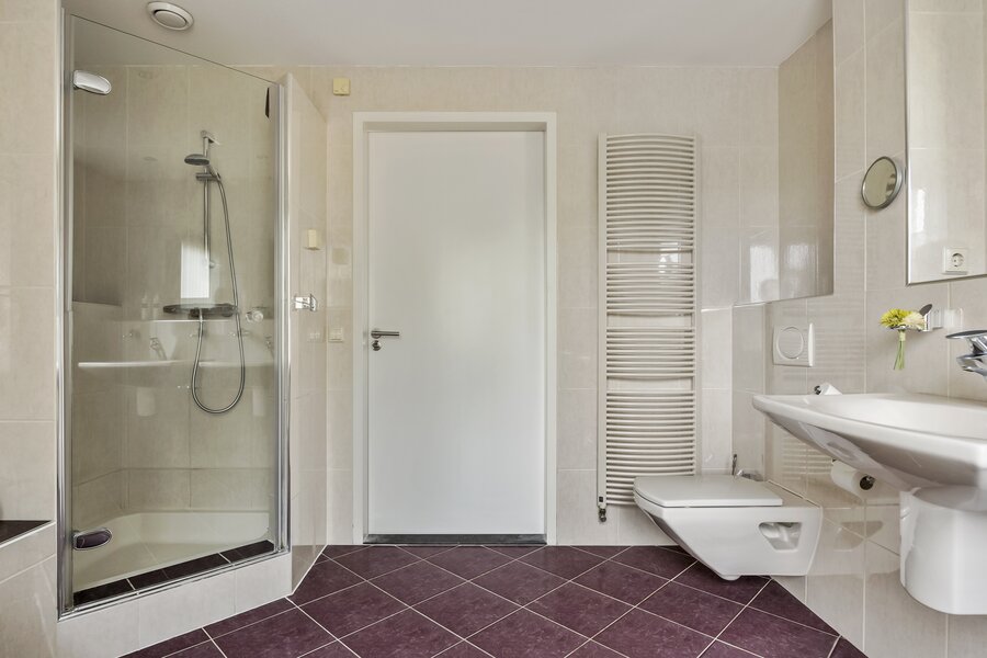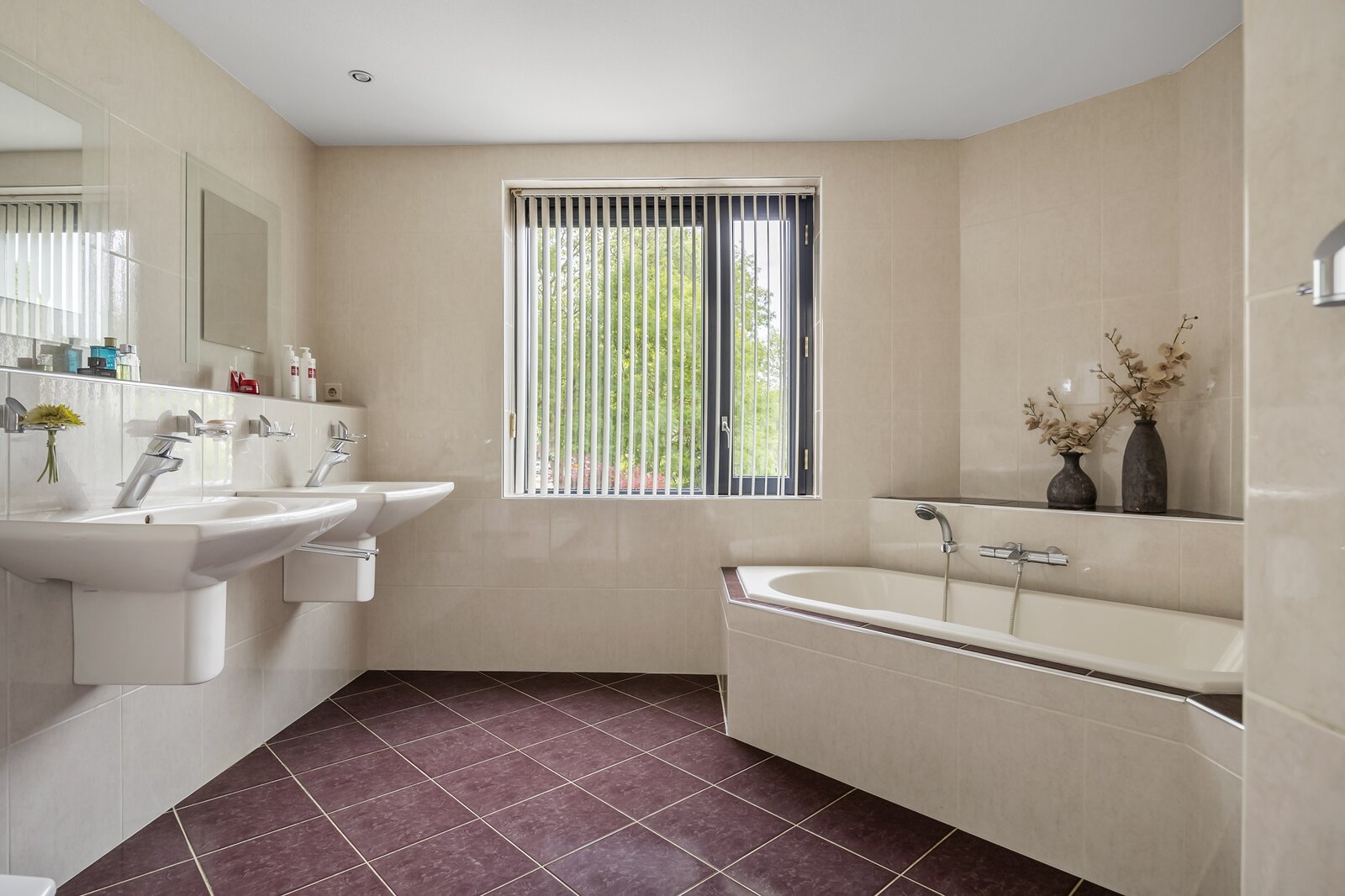 De royaal opgezette badkamer (ca. 10 m²) is volledig betegeld en bevindt zich aan de rustige achterzijde van de woning. Het grote raam in de achtergevel zorgt voor een prettige inval van natuurlijk daglicht, wat de ruimte een frisse en open uitstraling geeft.