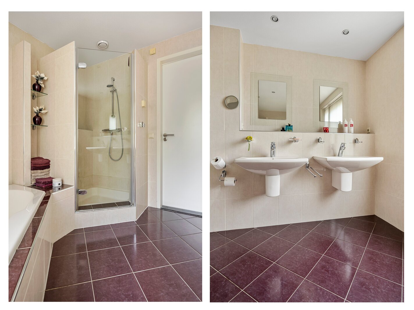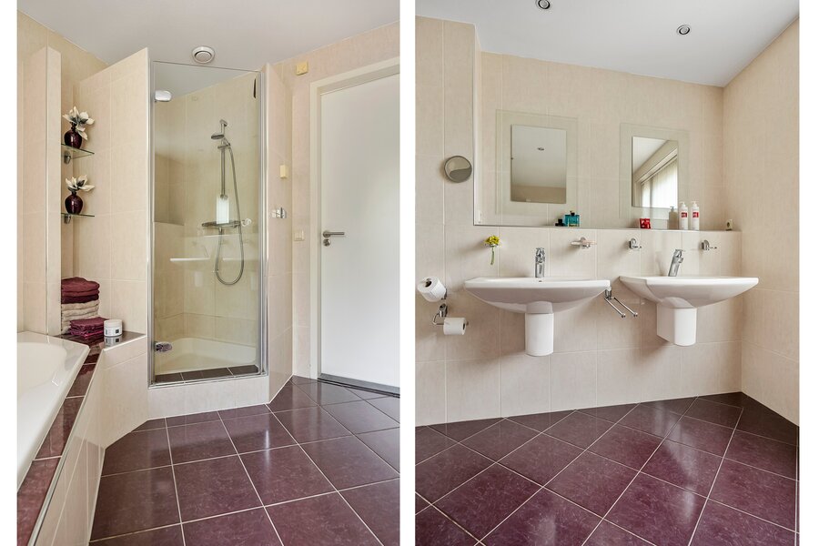 De badkamer is compleet uitgerust met alle denkbare voorzieningen: een comfortabel ligbad om heerlijk in te ontspannen, een separate douchecabine voor een verkwikkende start van de dag, een zwevend toilet, twee wastafels met dubbele spiegels en een stijlvolle designradiator.